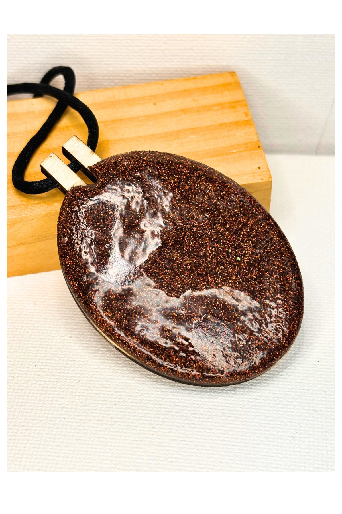 Backed with resin and brown glitter for a polished, cosmic touch