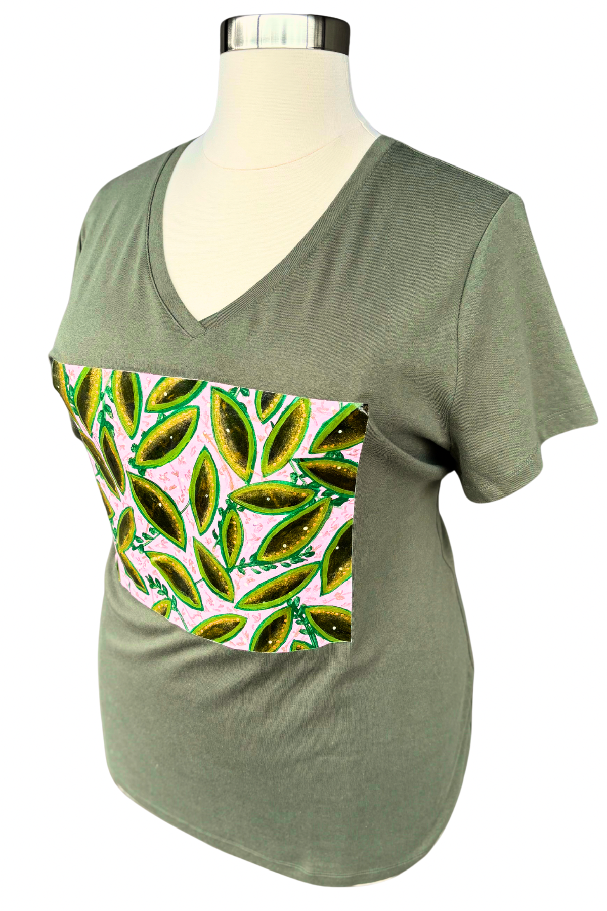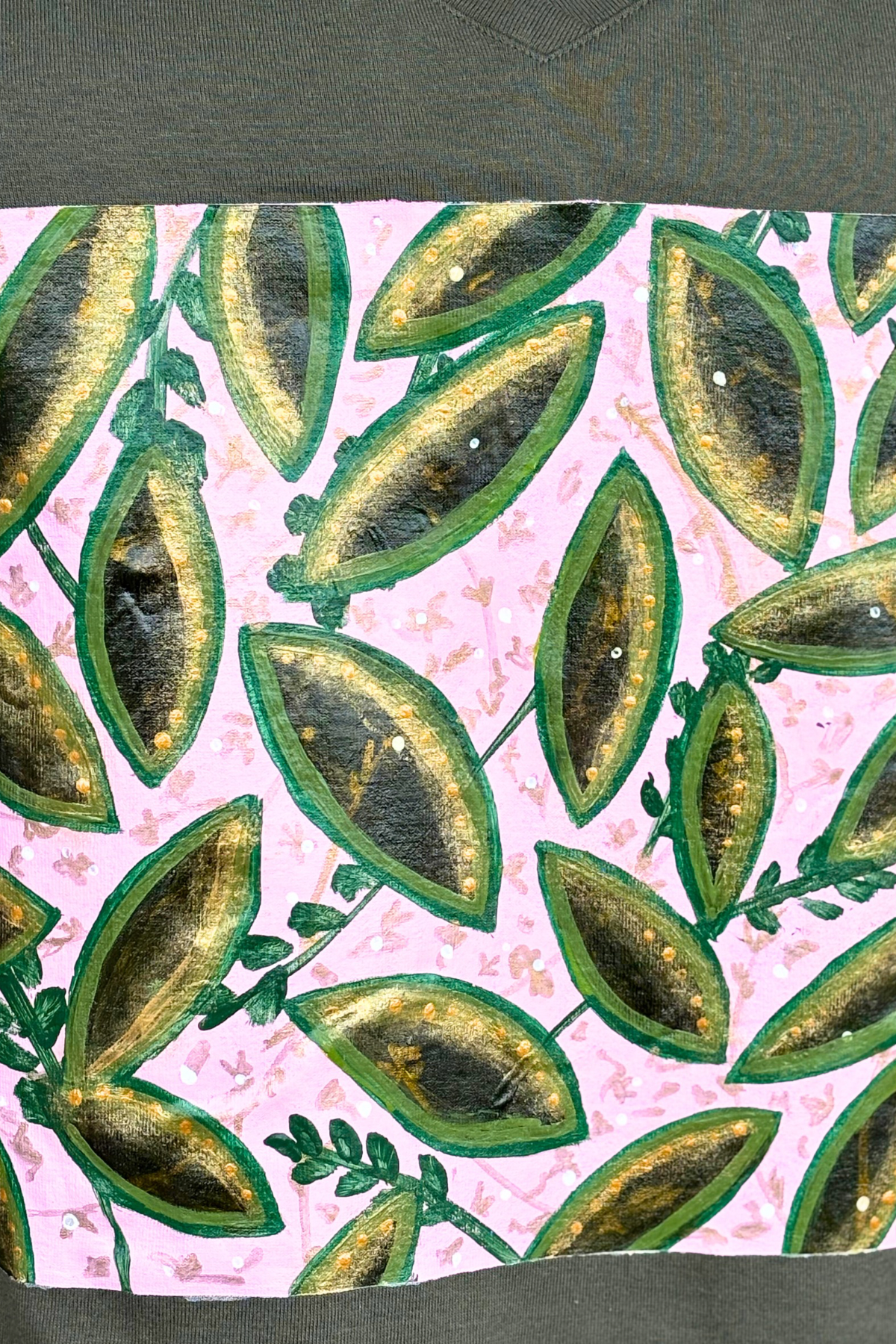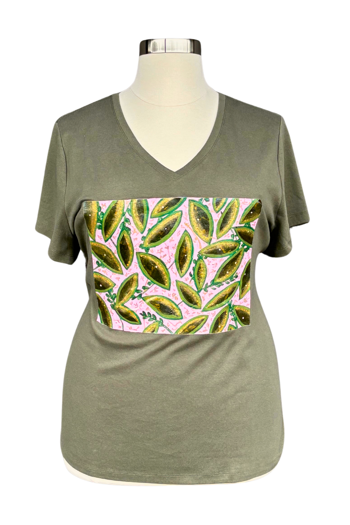 A little nature, a little shimmer, and a whole lot of personality. This one-of-a-kind, hand-painted tee transforms an everyday essential into a wearable piece of art. Lush green leaves edged with metallic gold pop against a soft pink background, creating a bold, botanical statement. Painted directly onto a high-quality deadstock tee, this piece ensures both sustainability and style.
