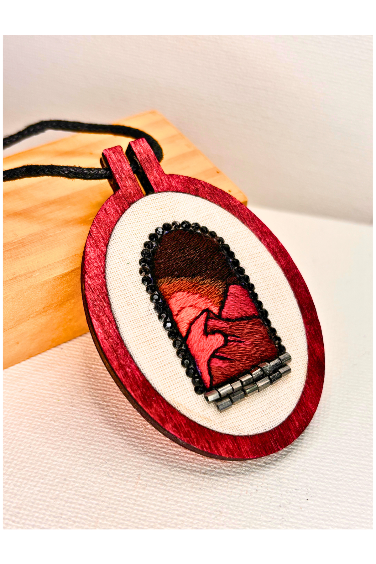 Let the beauty of a sunset glow brighten your day! This mini embroidery captures a stunning fiery sunset behind tranquil mountains or rolling sand dunes. With rich hand-stitched colors, sparkling black bead accents, and metallic embellishments, this little piece is full of personality and warmth. The vibrant red frame and glittery dark pink backing add an extra pop of fun to this tiny treasure.