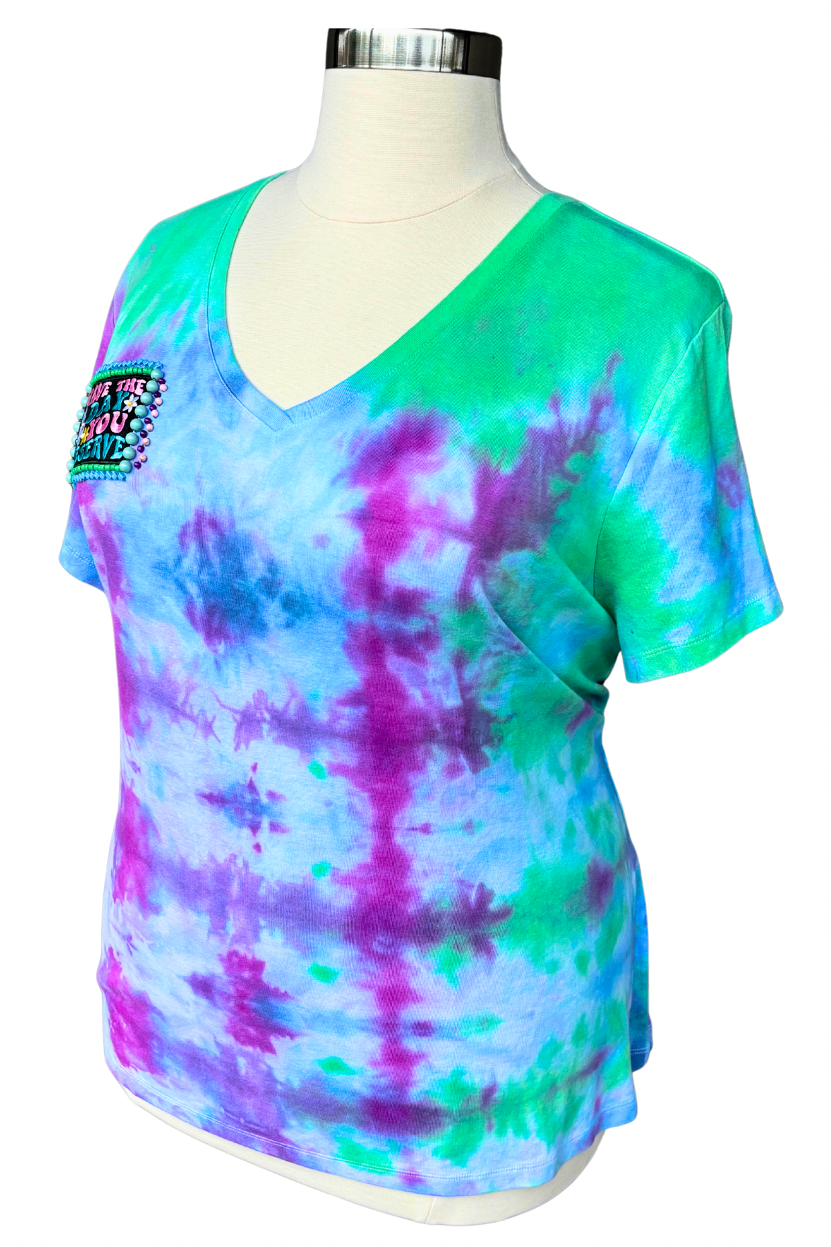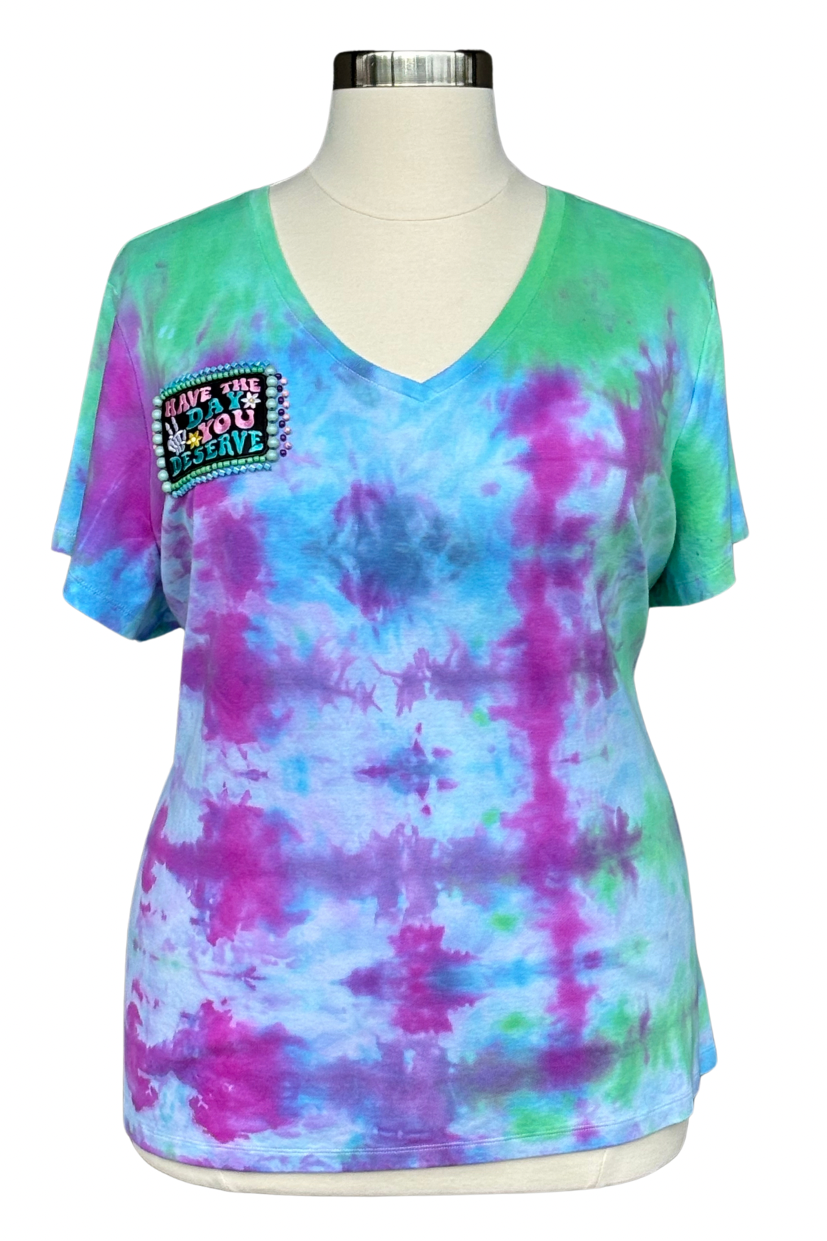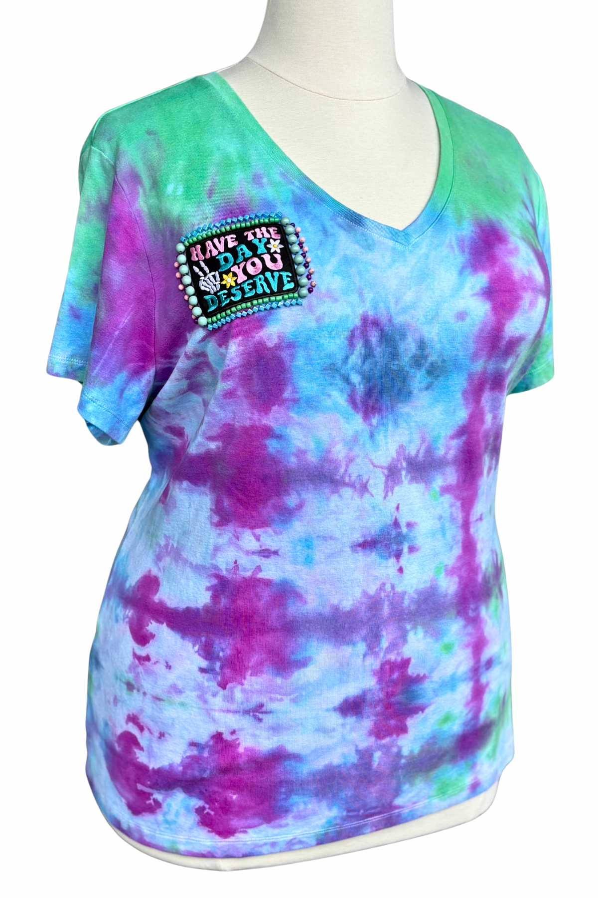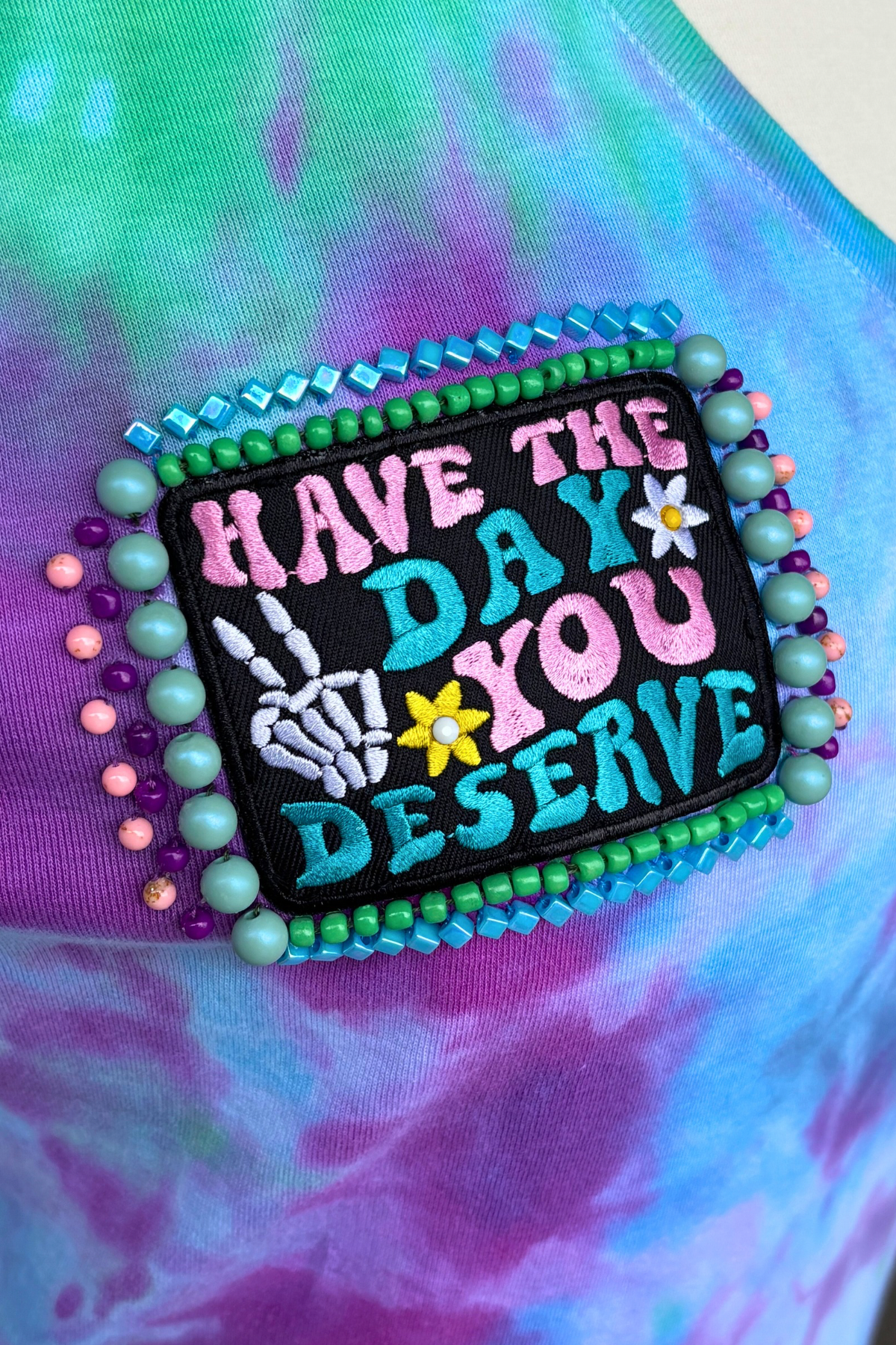 A little sweet, a little shady—this tee says what you’re thinking. Tie-dyed in dreamy swirls of green, purple, and blue, it features a bold patch that reads “Have the day you deserve”—complete with peace fingers, a daisy, and a skeleton hand. Hand-beaded in juicy pastels and glossy accents, it’s a wearable reminder that the universe keeps receipts.