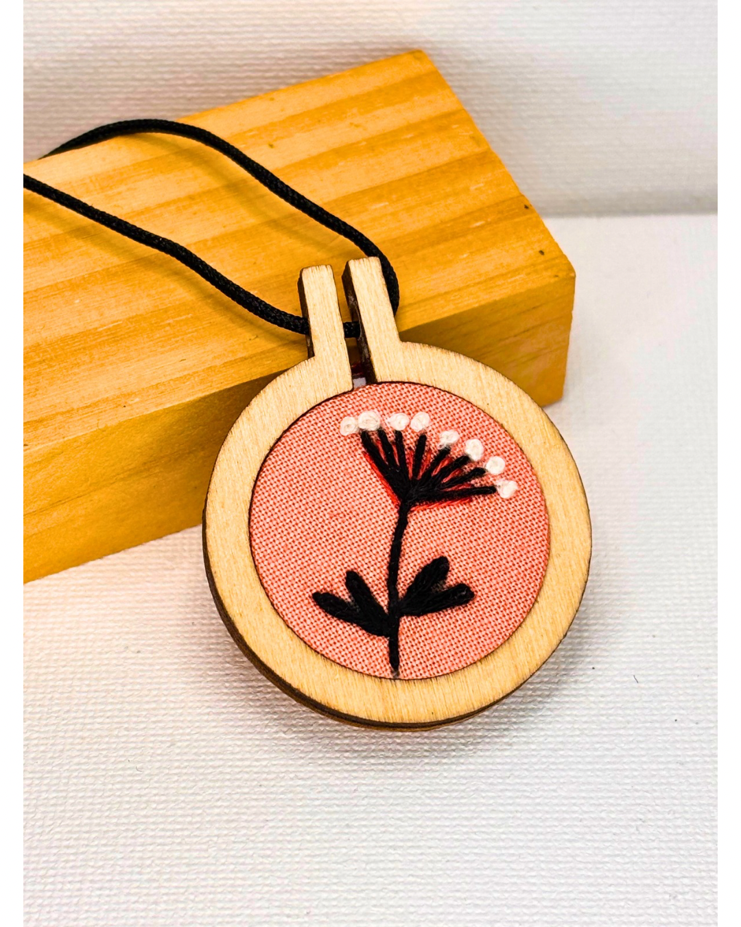 A little piece of sunset magic! This hand-embroidered mini hoop features a bold, stylized flower with deep black leaves and delicate white buds, set against a warm coral background. The contrast makes this piece feel modern yet organic, like a silhouette against a glowing evening sky. The back is coated in a dazzling mix of gold and peach glitter, giving it the perfect golden-hour shimmer.