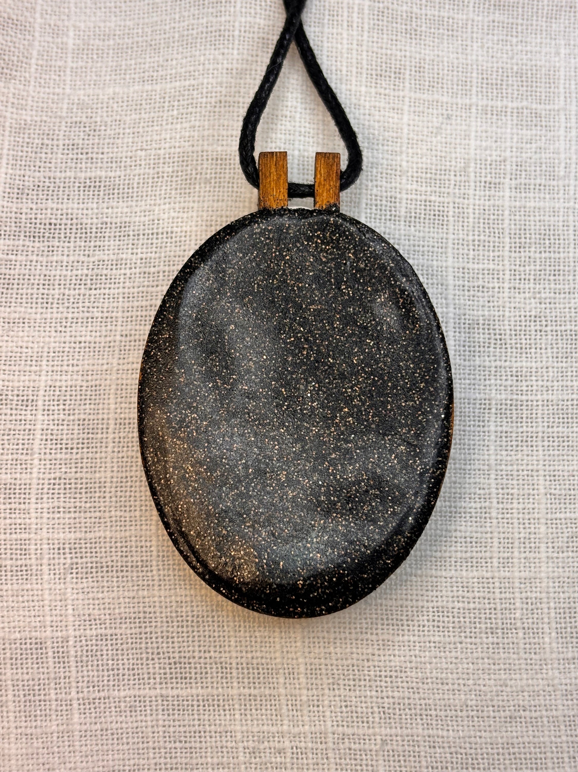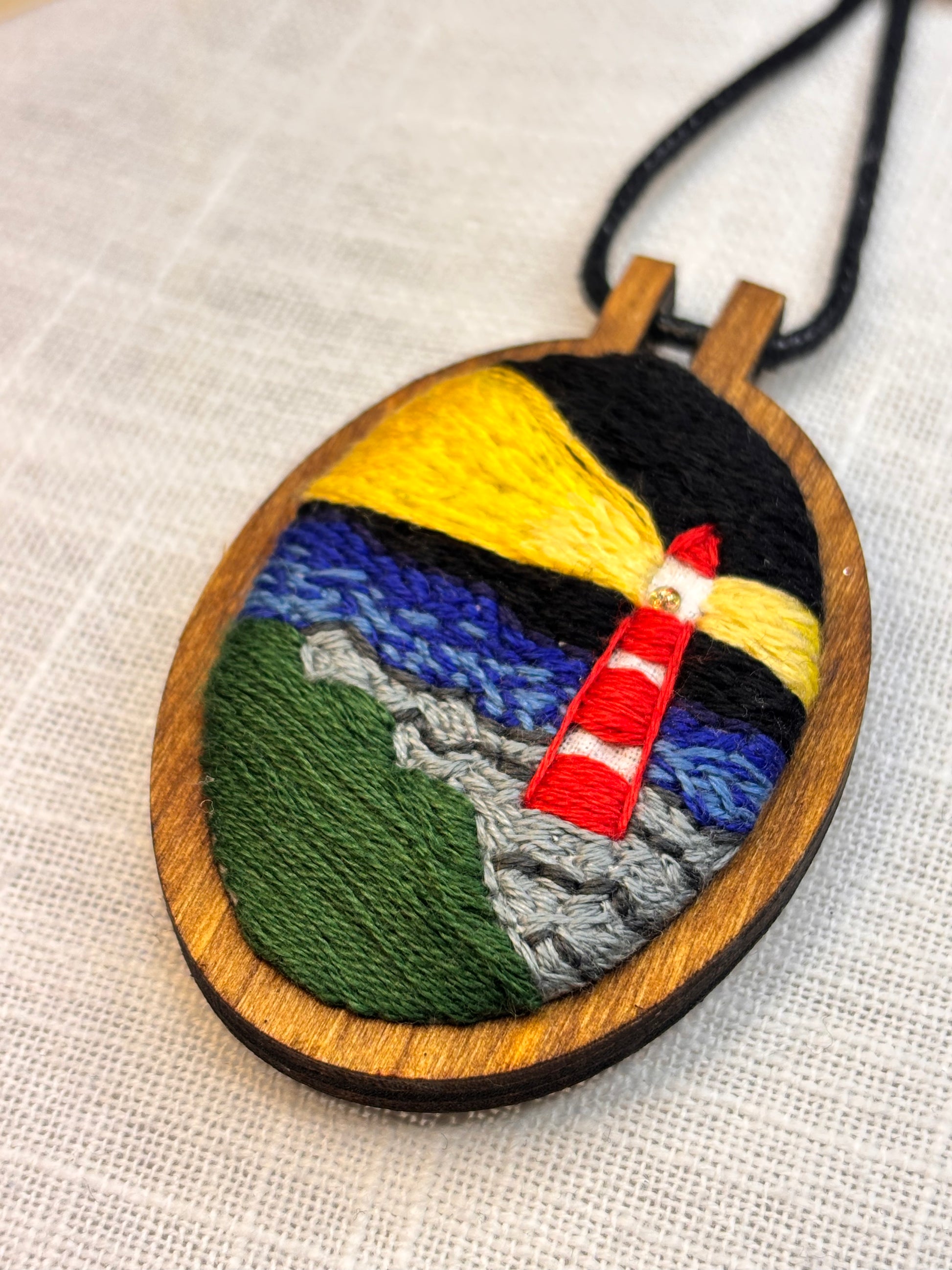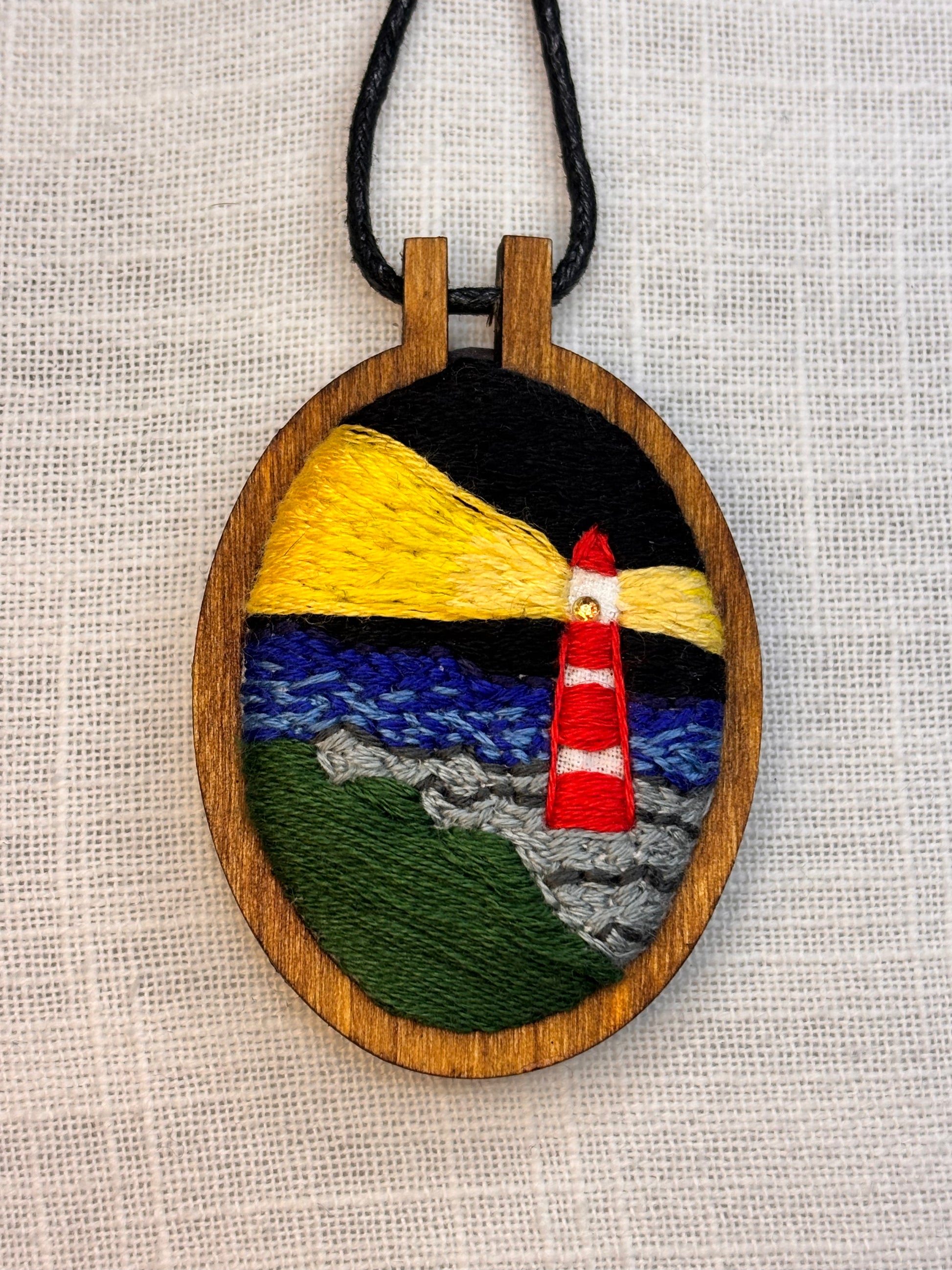 This hand-embroidered mini hoop pendant captures the powerful glow of a lighthouse guiding the way through the night. Golden rays shine brightly against a dark sky with vibrant blue waves crashing along the rocky coast below. Framed in a 2” x 1” oval wooden hoop, this piece includes a small bead detail at the top of the red-and-white lighthouse for a subtle, eye-catching touch. The back is sealed with a sparkling black glitter finish, reminiscent of the night sky.