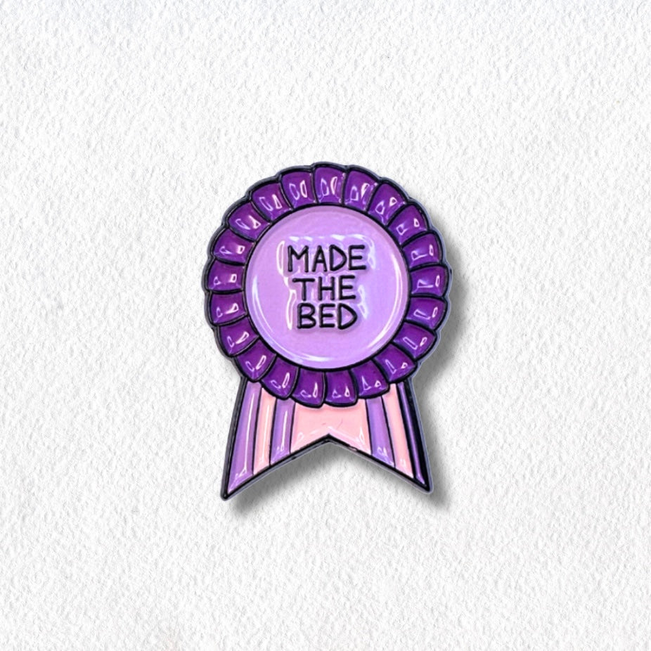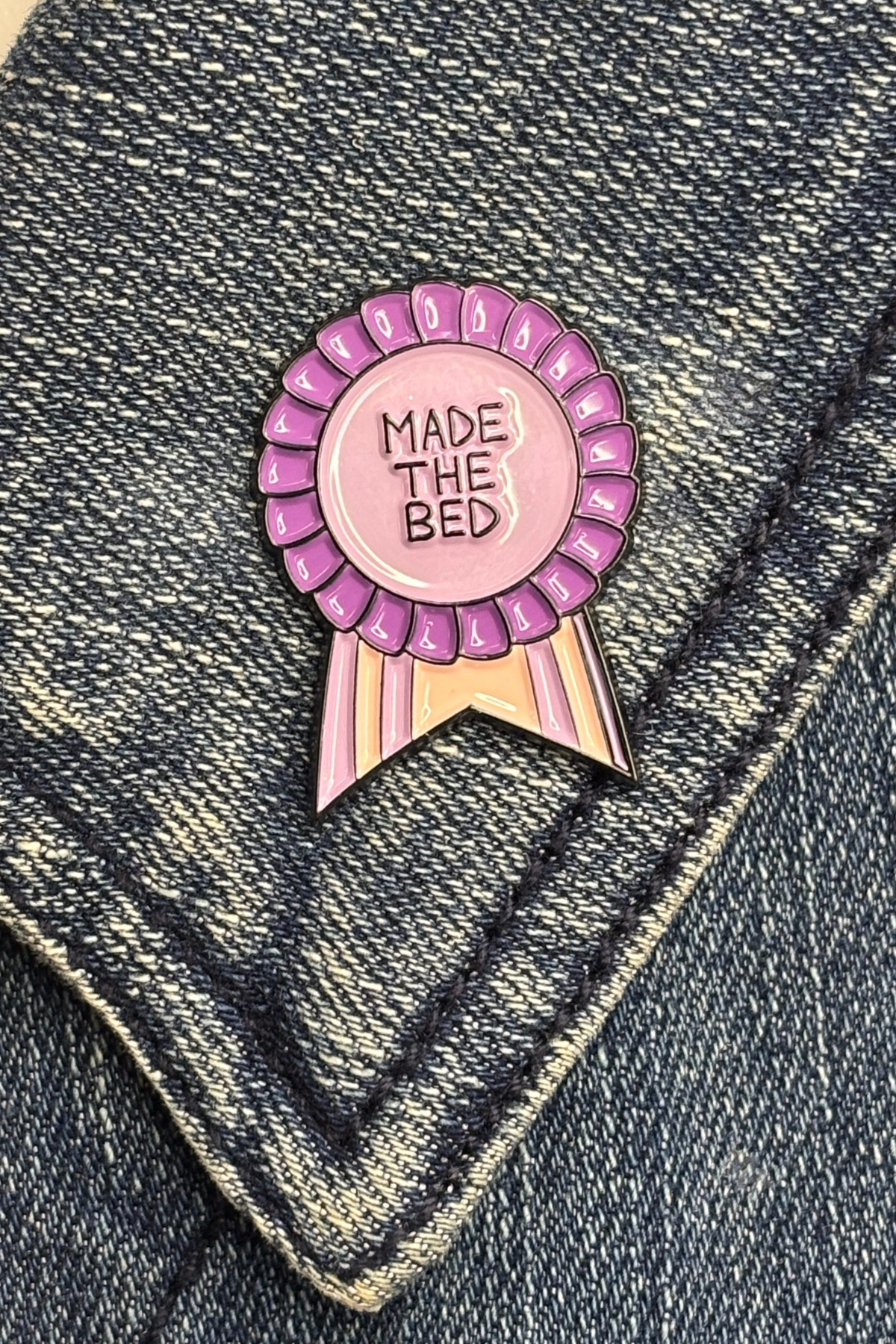 Some days, victory looks like tucking in a corner and fluffing a pillow. This lavender-and-pink enamel pin is here to celebrate your domestic triumph with style and sarcasm. It’s like a gold medal, but make it cozy.