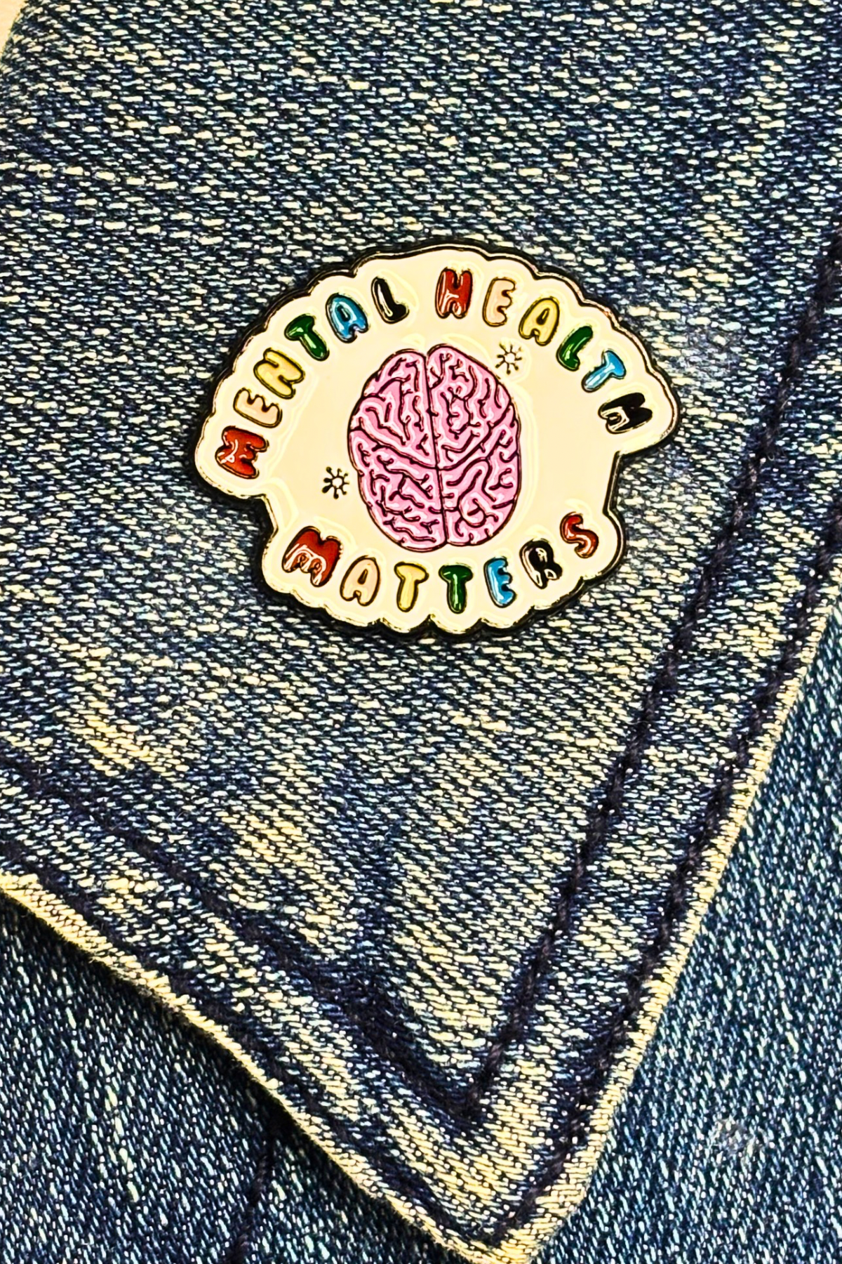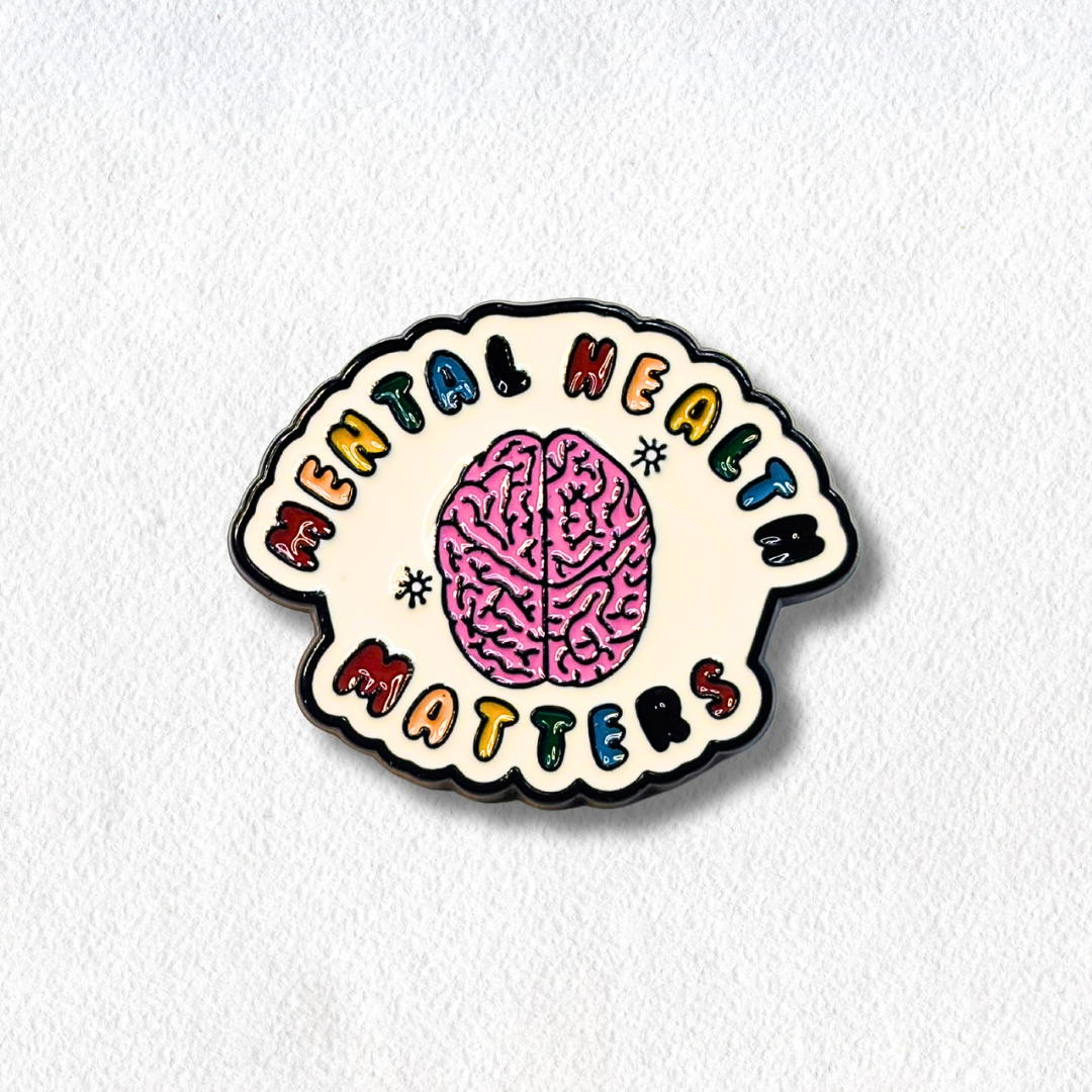 Give your jacket, backpack, or lanyard a pep talk with this bright and brainy enamel pin! Featuring a pink brain front and center and surrounded by rainbow bubble letters that proudly say Mental Health Matters, this pin is a cheerful little reminder that taking care of your mind is a power move.