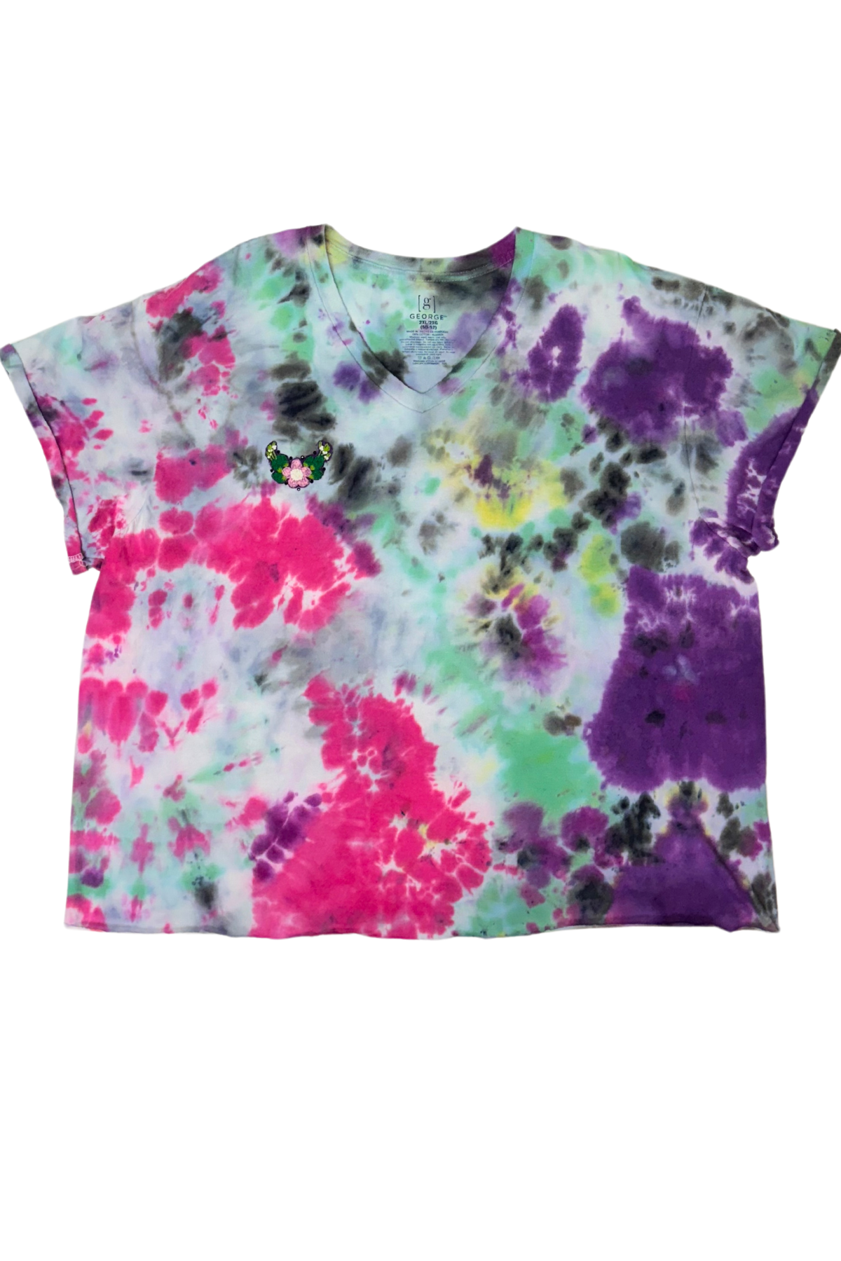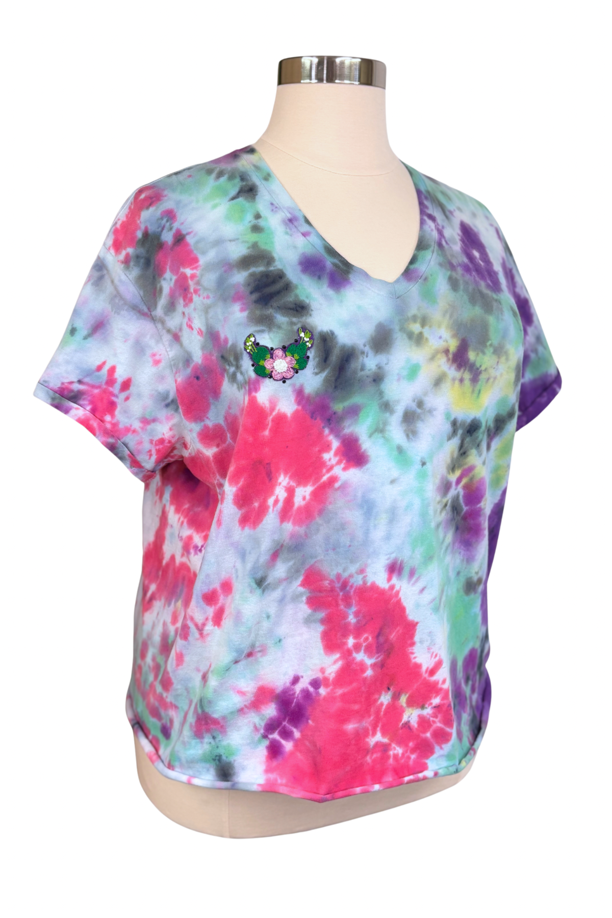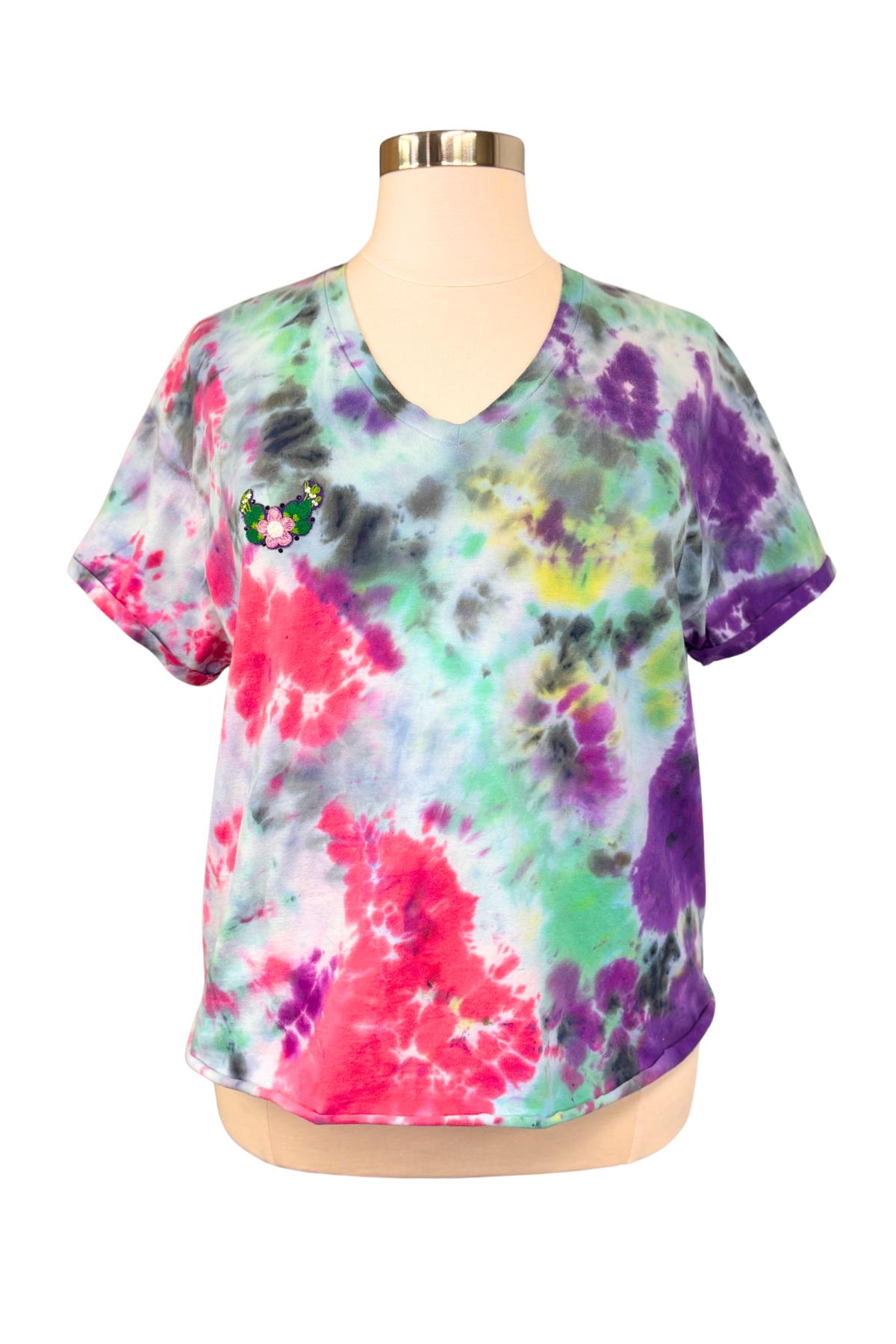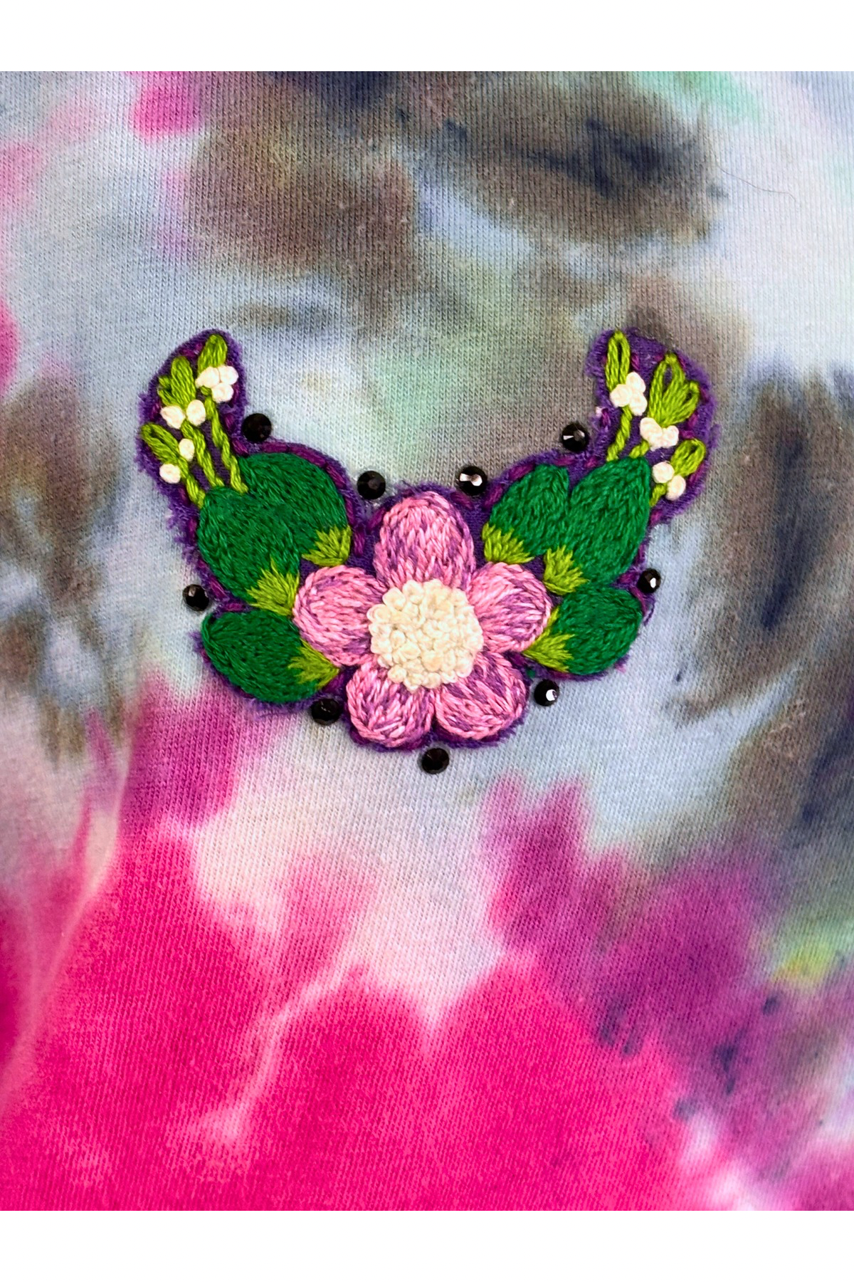 This tee is here to crash the garden party—in the best way. Bursting with vibrant, hand-dyed color, it’s a full-on celebration of mess, joy, and blooming things. A sweet embroidered patch sits over the heart, featuring a pink flower surrounded by green leaves, tiny white buds, and hand-sewn black bead accents. It’s soft and wild, with just enough sparkle to say, “Yes, I made it out of bed today, and I look incredible.”