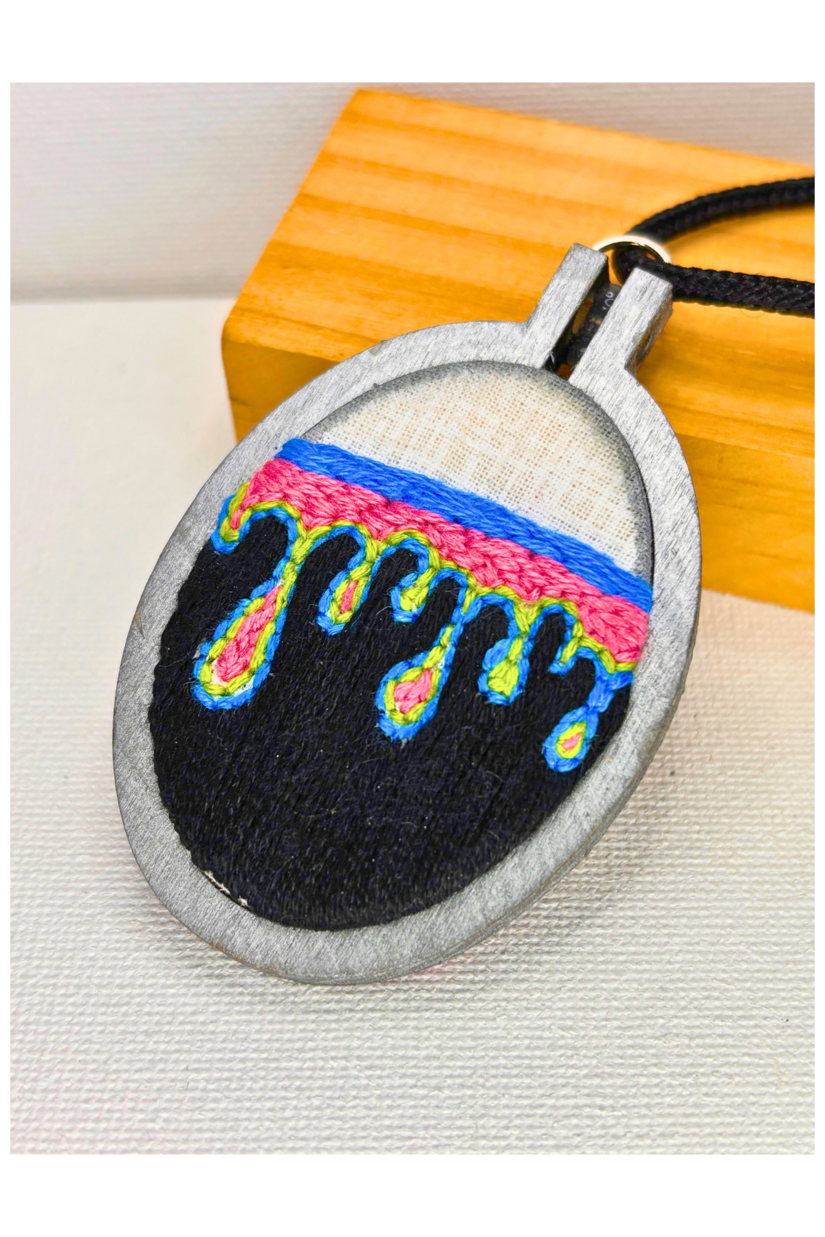 Drippy, trippy, and absolutely electric! This mini hoop looks like a technicolor daydream, featuring neon pink, blue, and yellow embroidery melting into deep black like a vibrant cosmic spill. The silver wood frame gives it an industrial edge, while the back explodes with a glitter bomb of pink and green resin- because subtlety is overrated.