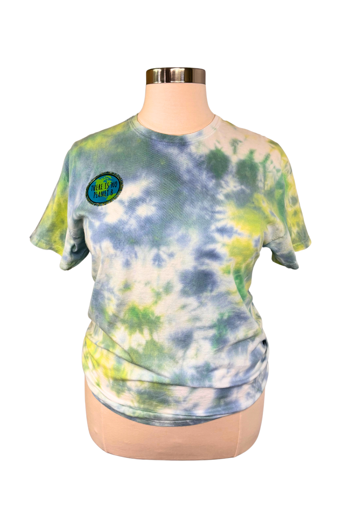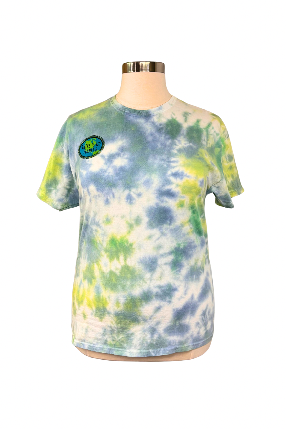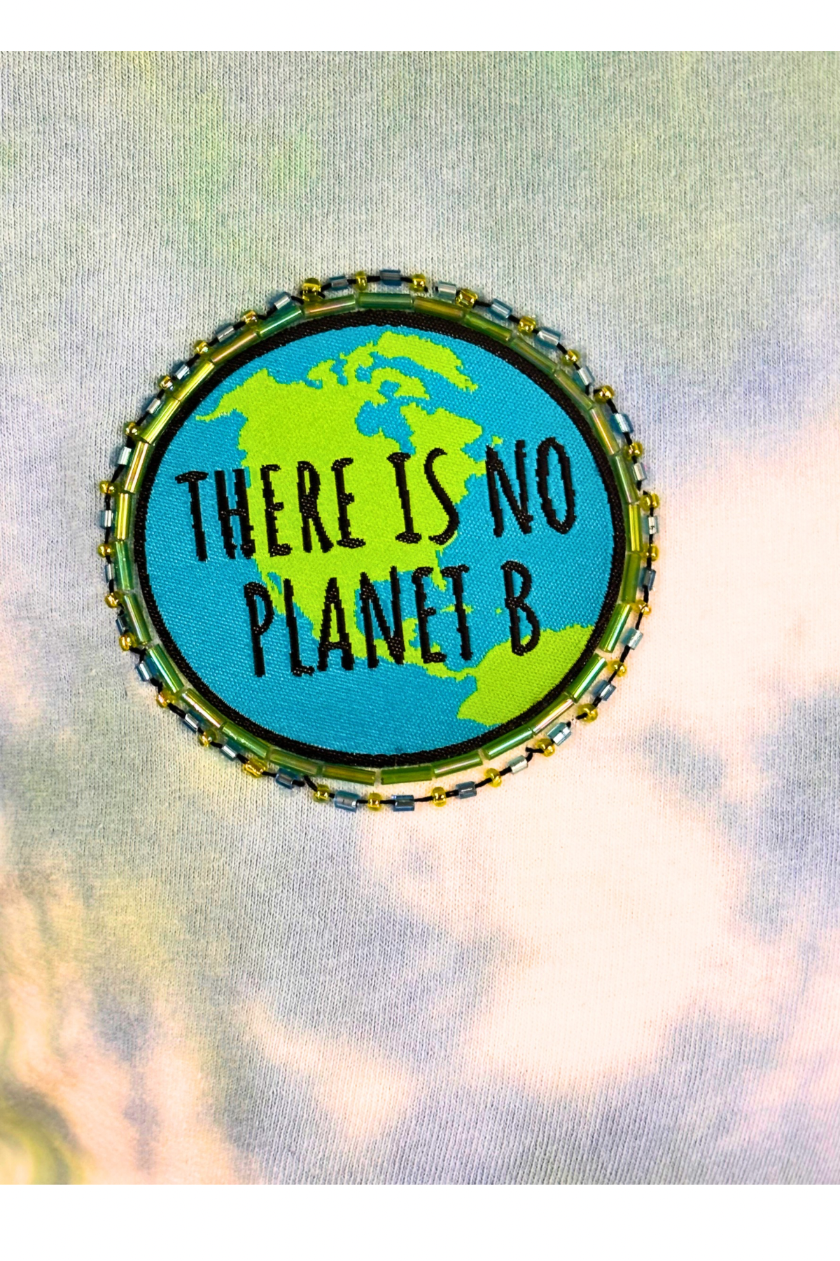 For the earth-lovers, change-makers, and everyday rebels who know there’s no backup plan for our planet. This hand-dyed cotton tee is a dreamy swirl of sky blue, leafy green, and soft white—like Earth herself. Front and center: a hand-beaded, upcycled patch that says it loud and clear—There Is No Planet B.