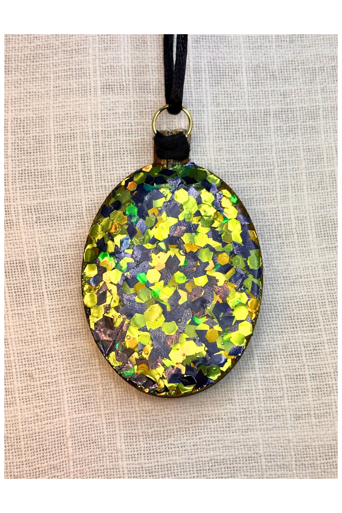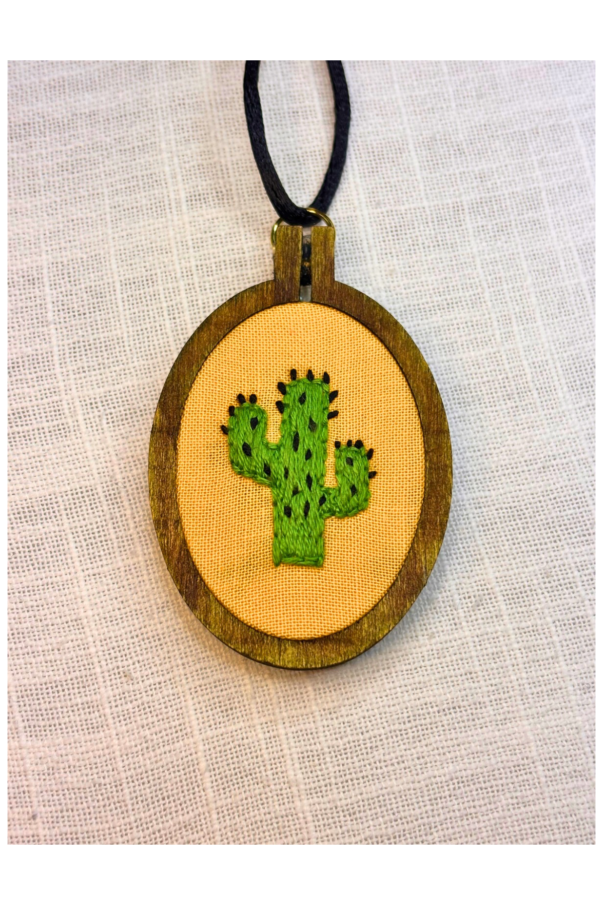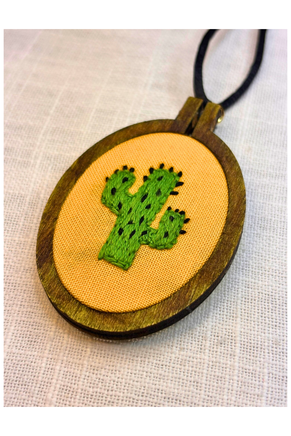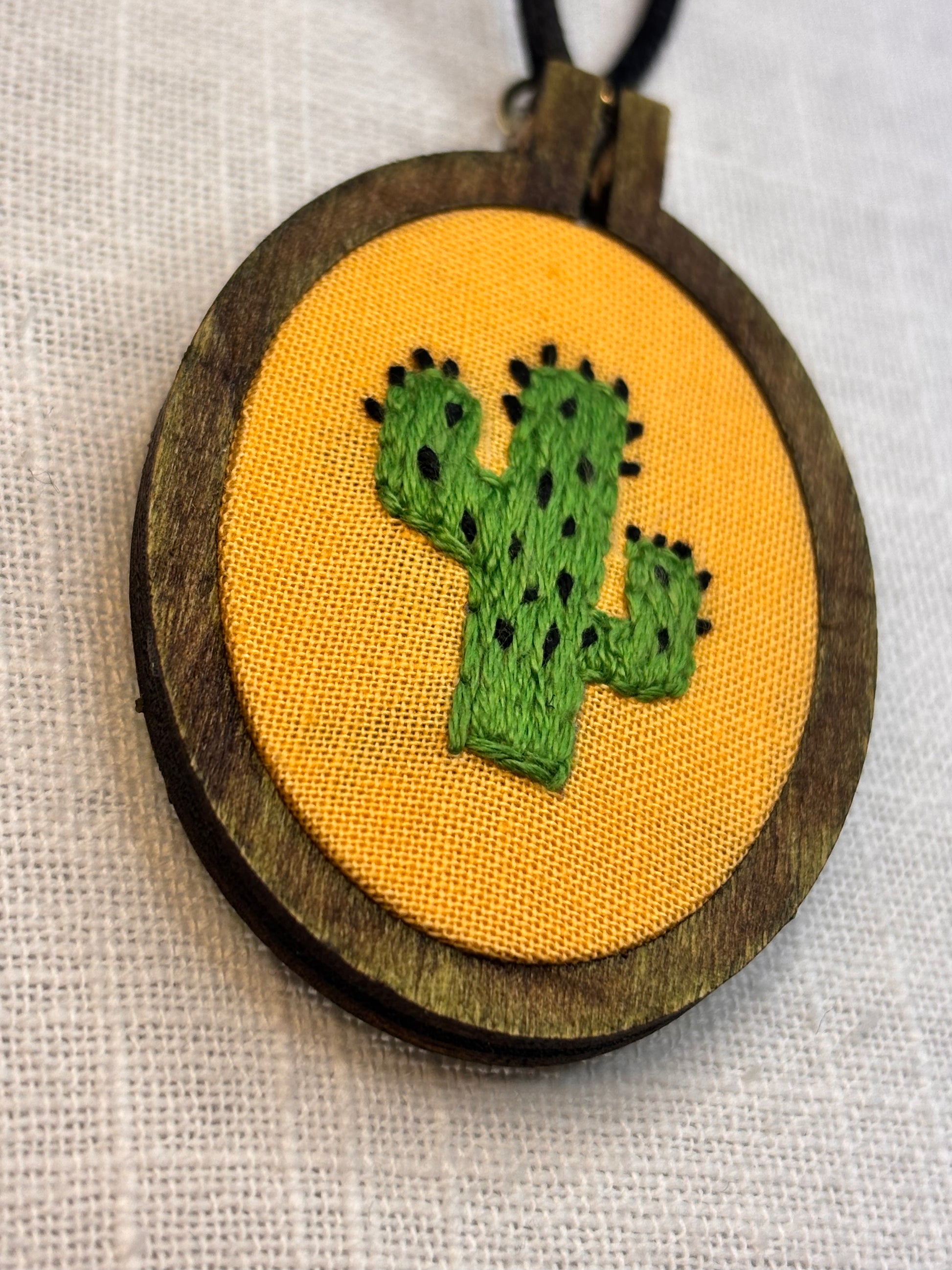 Celebrate the desert’s charm with this vibrant mini hoop! Featuring a lively green cactus set against a golden background, this hand-embroidered piece pops with personality. Framed in a rustic wooden hoop, the back dazzles with a glittery confetti resin finish for an unexpected twist.