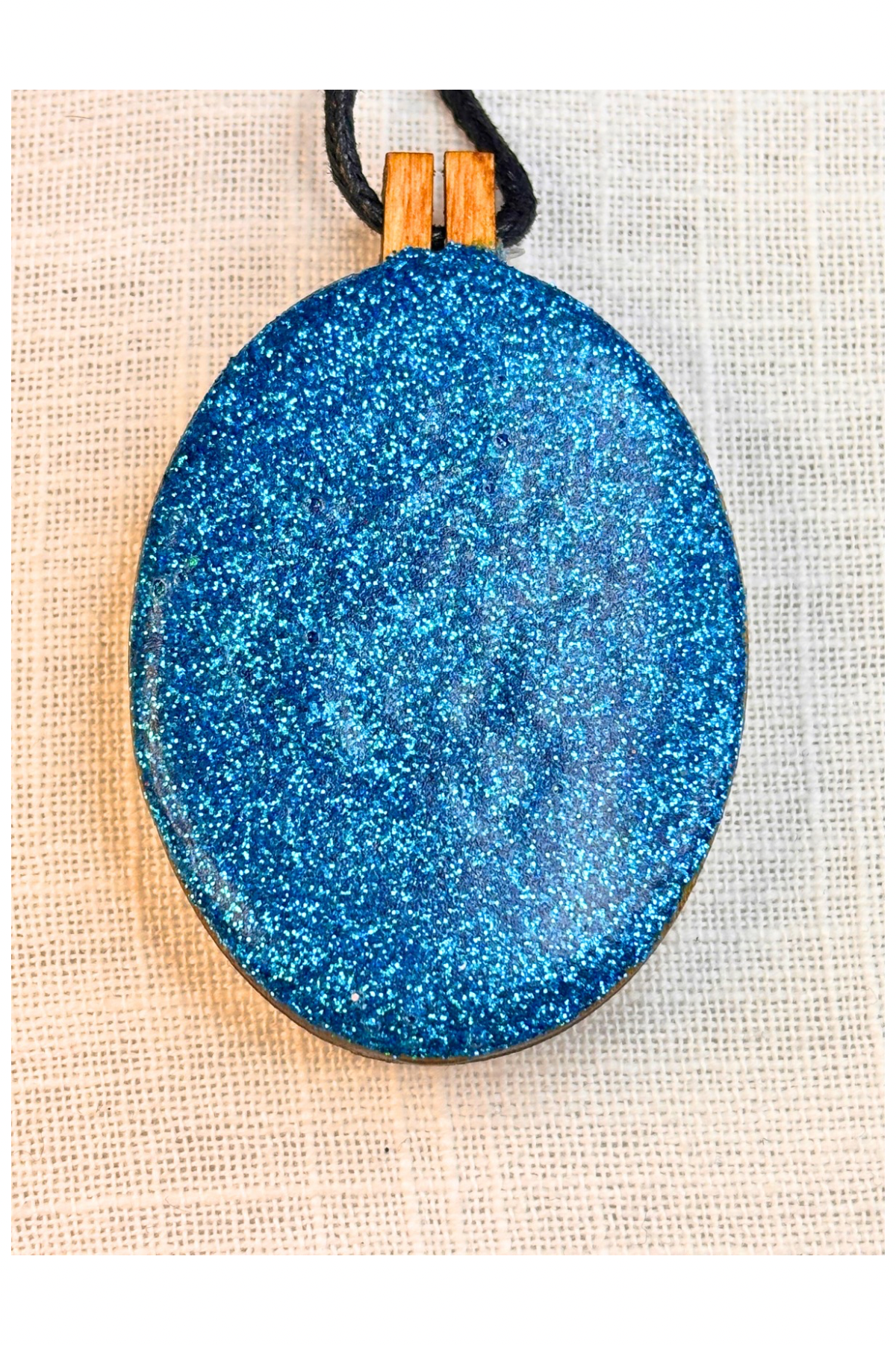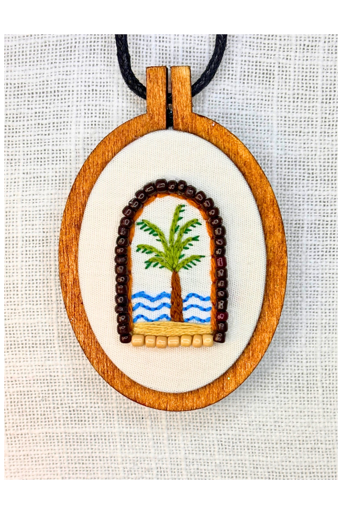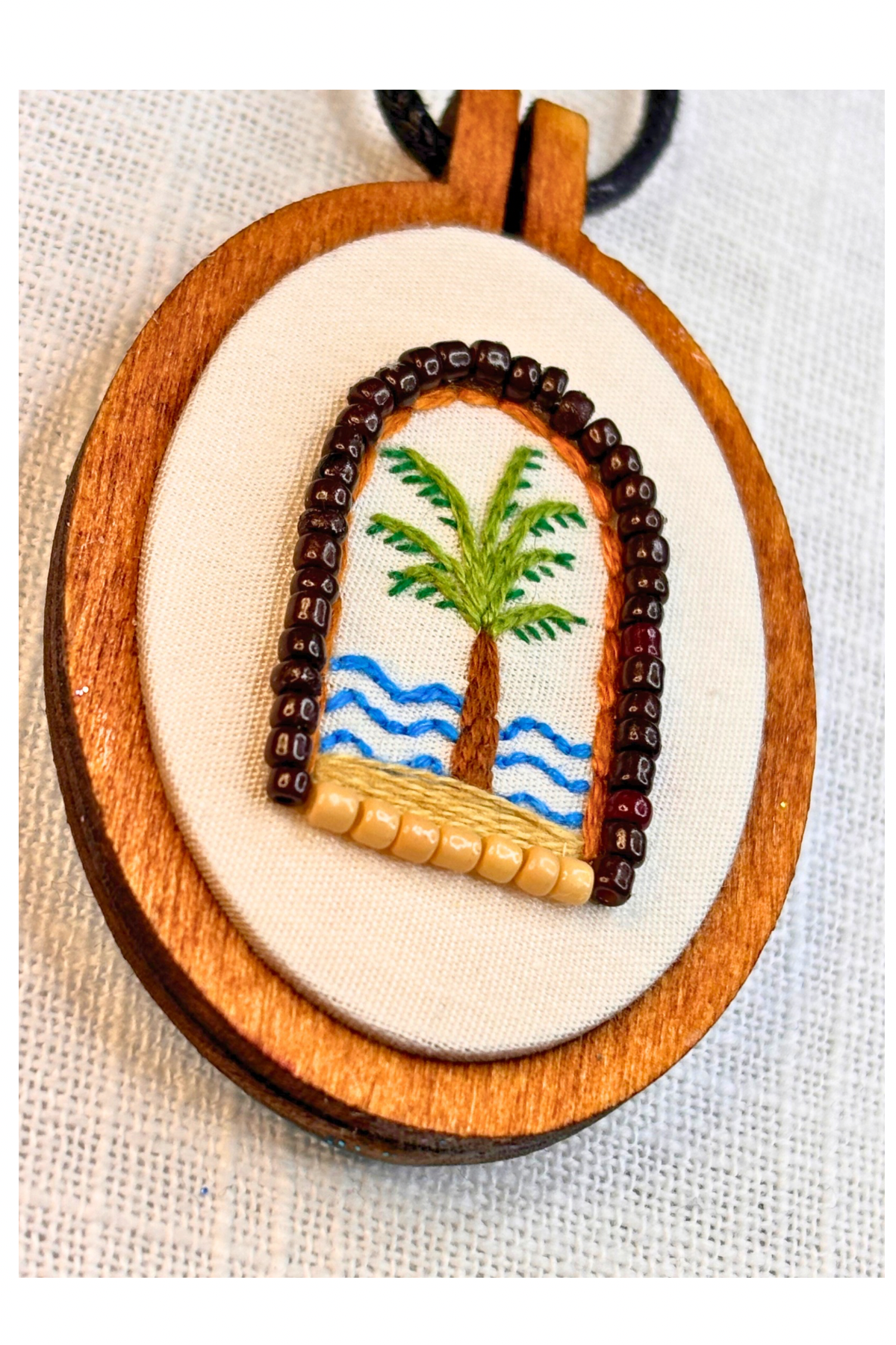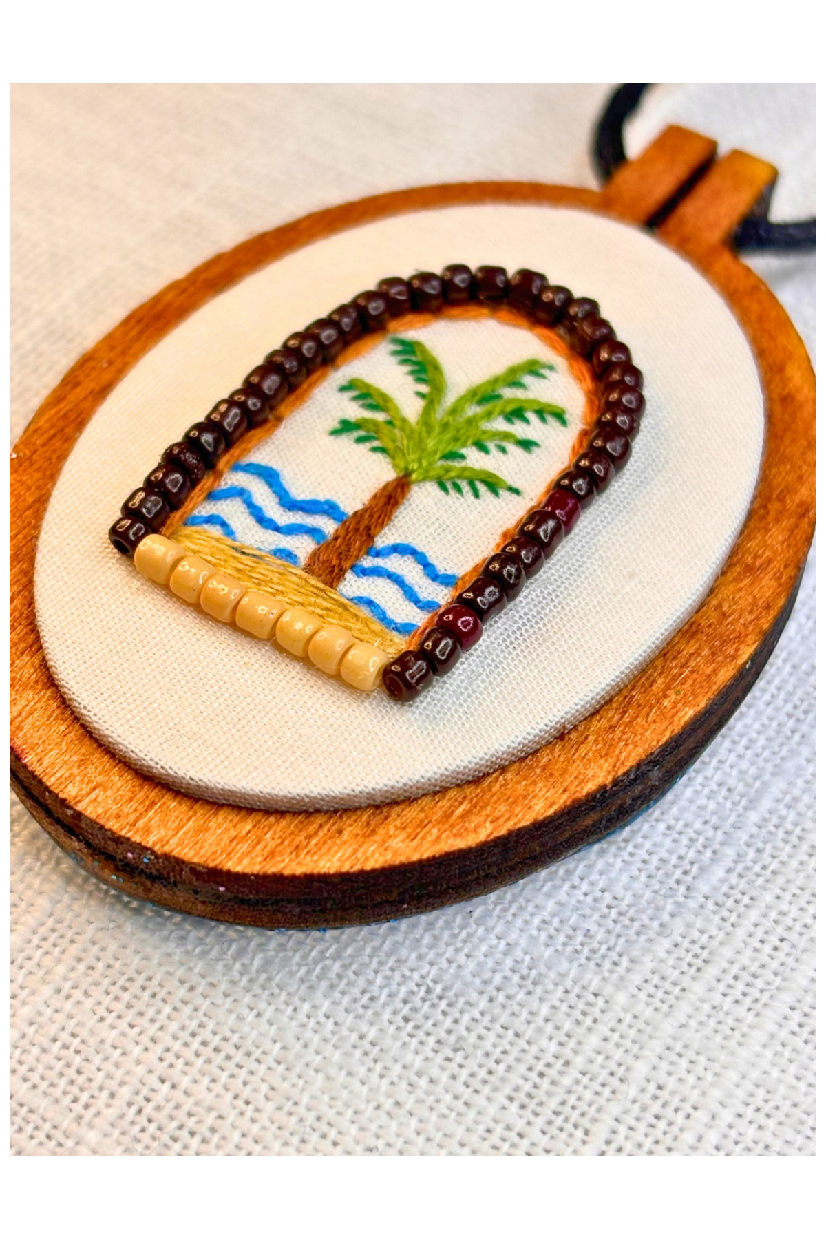 Feel the calming vibes of the tropics with this hand-embroidered mini hoop pendant. Featuring a lush palm tree swaying in front of rolling blue waves, this piece brings a serene beach scene to life. Framed in a rustic wooden hoop and accented with beads for added depth, it’s the perfect reminder of sunny days and ocean breezes. The back is sealed with a dazzling blue glitter finish, echoing the shimmer of the sea.
