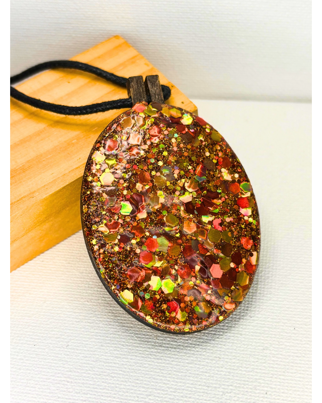 Backed with resin and fiery autumn-toned glitter for a bold, unexpected finish