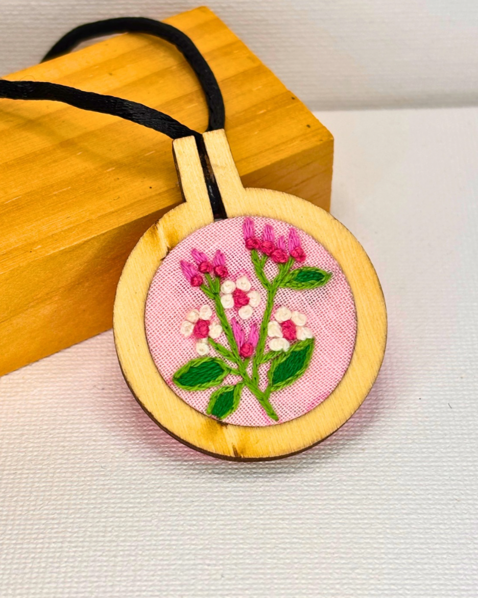 Hand-embroidered pink and white floral design on a pink fabric background.
