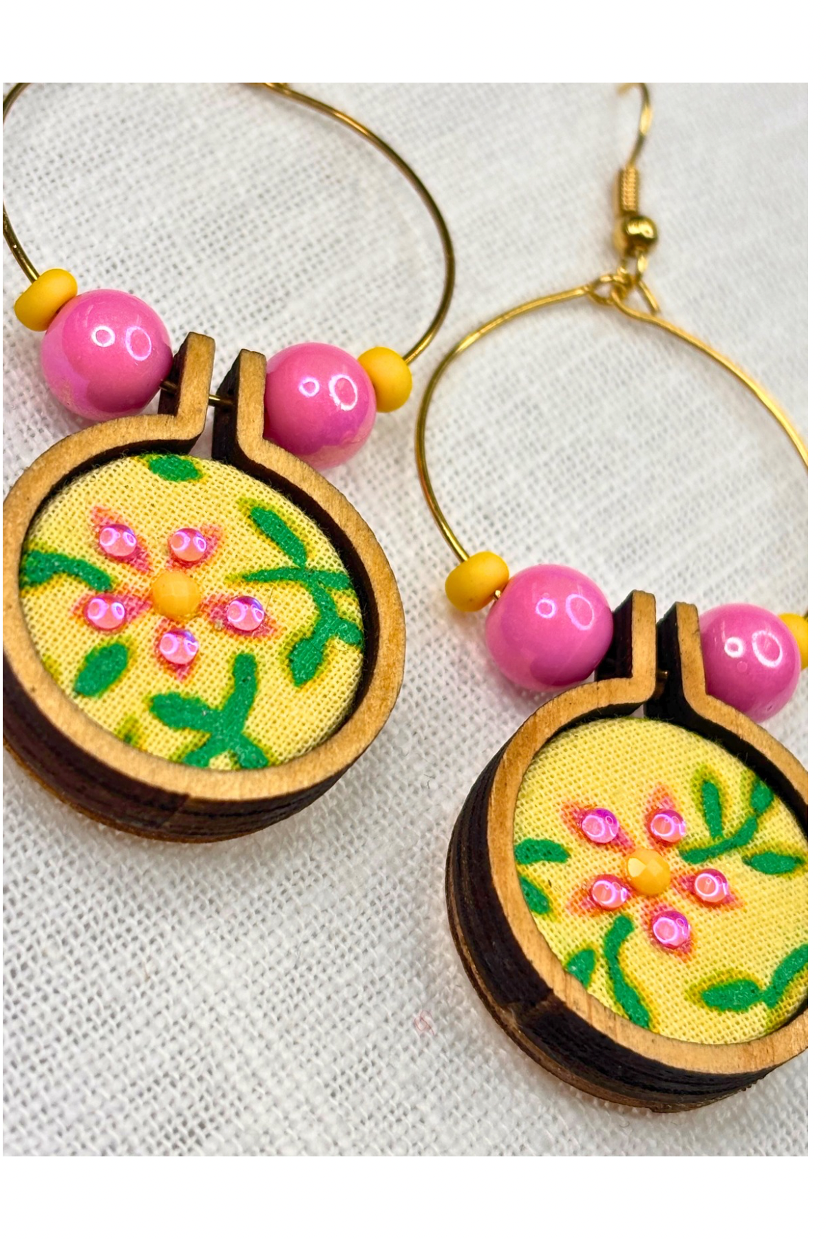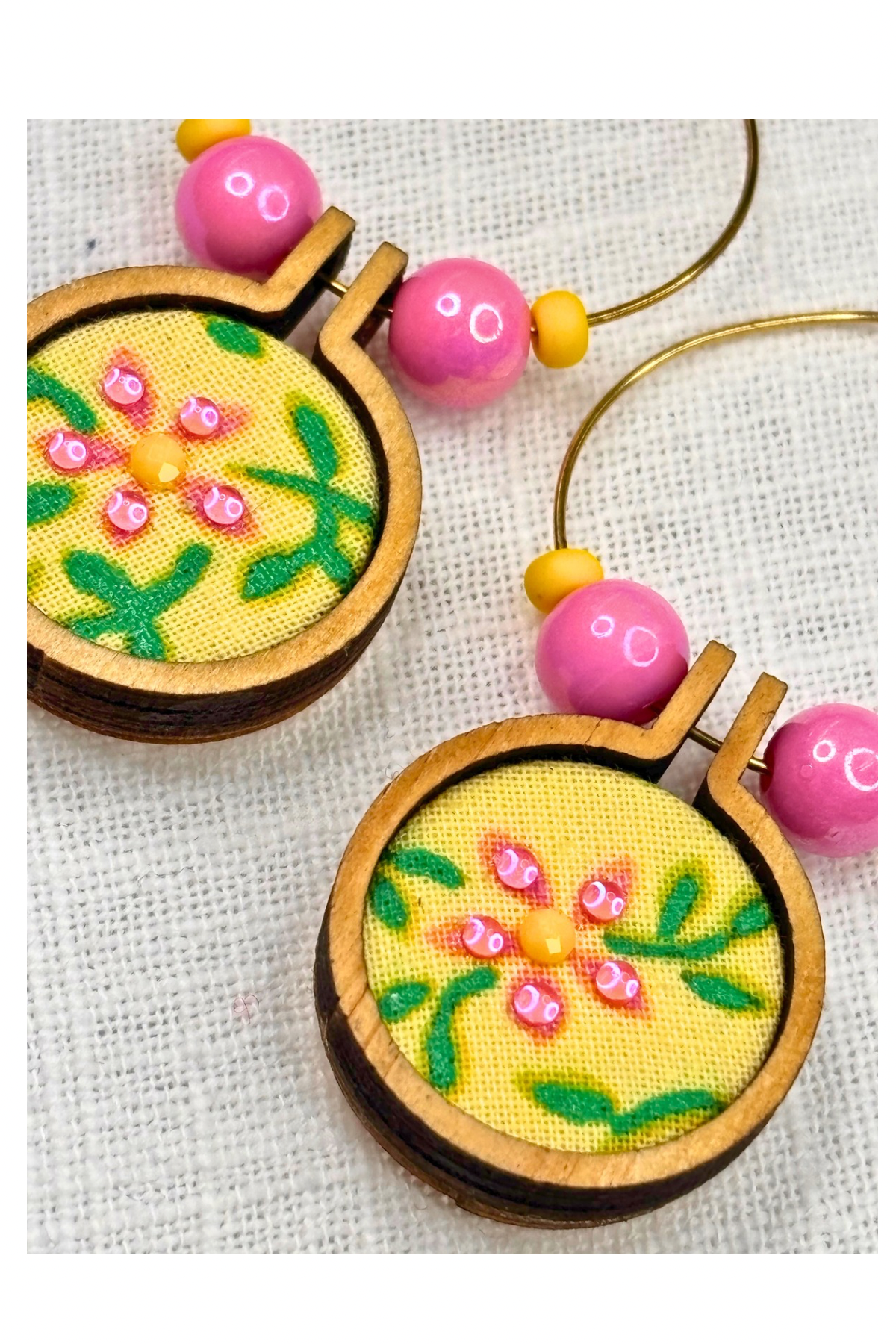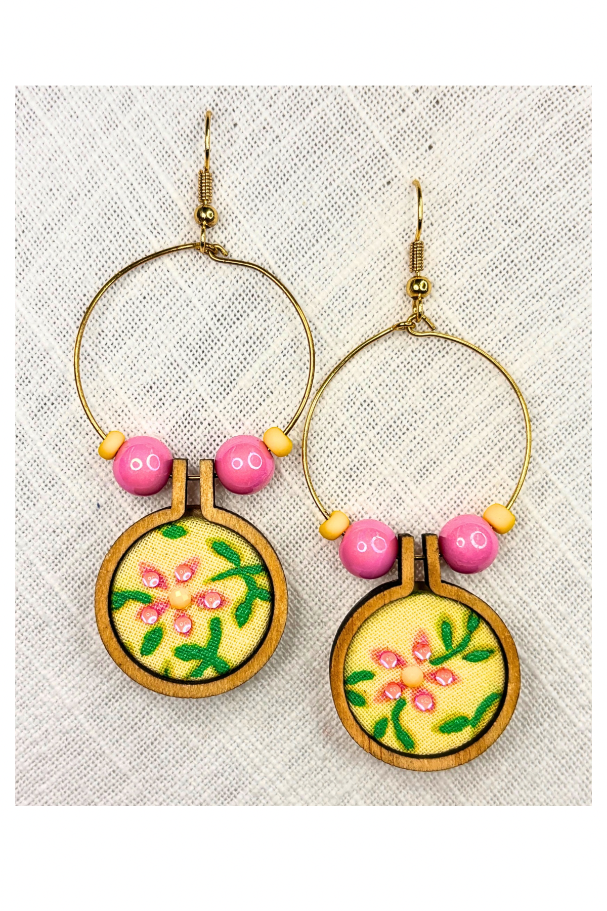 Bring a pop of sunshine to your look with these cheerful floral hoop earrings! Featuring vibrant flowers on a bright yellow fabric, paired with bold pink and yellow beads, these earrings are pure happiness in jewelry form. Lightweight and full of personality, they’ll make any outfit sunnier!