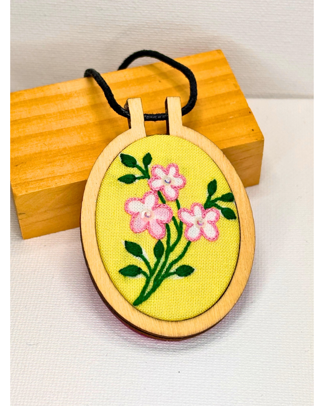 A tiny bouquet that never fades! This hand-embroidered mini hoop features delicate pink blossoms on a cheerful yellow background, each bloom stitched with care and accented with tiny bead centers. The back is coated in sparkling pink glitter, adding a pop of shimmer to this floral beauty. A perfect piece for flower lovers, bright color enthusiasts, or anyone who needs a little wearable sunshine!