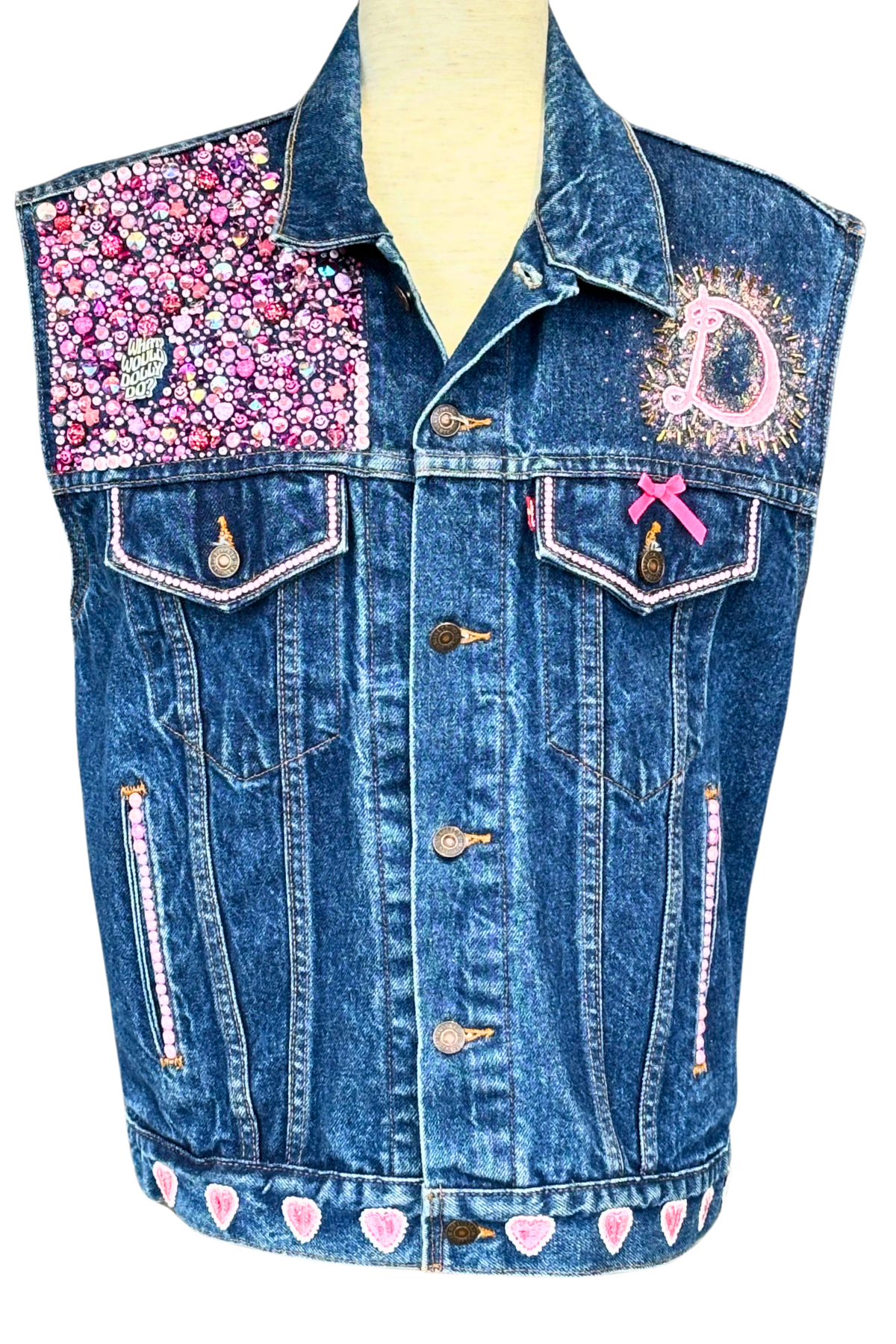 This vest is pure rhinestone cowgirl fantasy with a wink and a whole lotta heart. Covered in hand-beaded details, sparkling fringe, and custom embellishments, it’s a full-on love letter to all things pink, playful, and powered by Dolly Parton energy. Featuring rhinestones, fringe, glittery lettering, and statement patches like “In Dolly We Trust” and “What Would Dolly Do?”—this piece turns denim into a bold, bedazzled declaration.