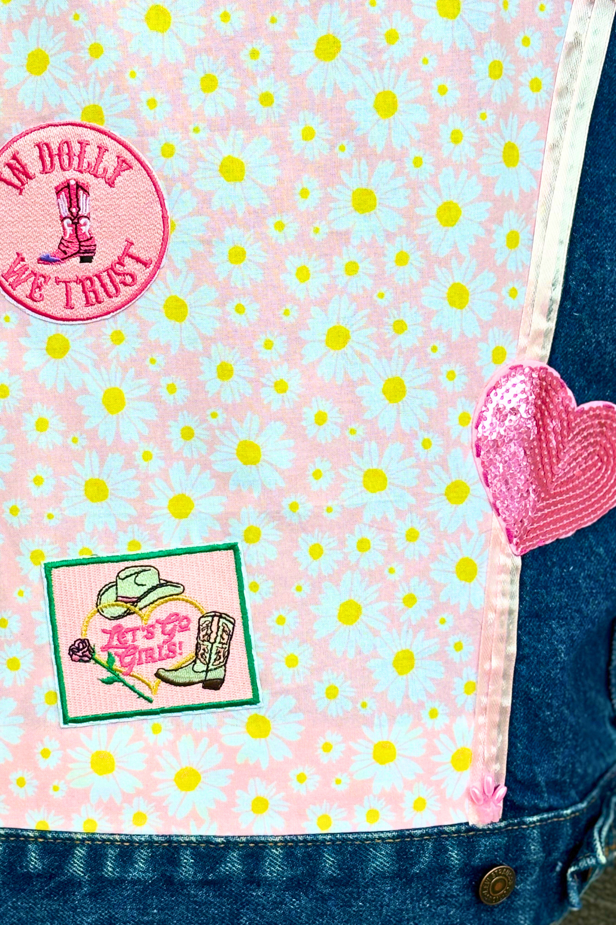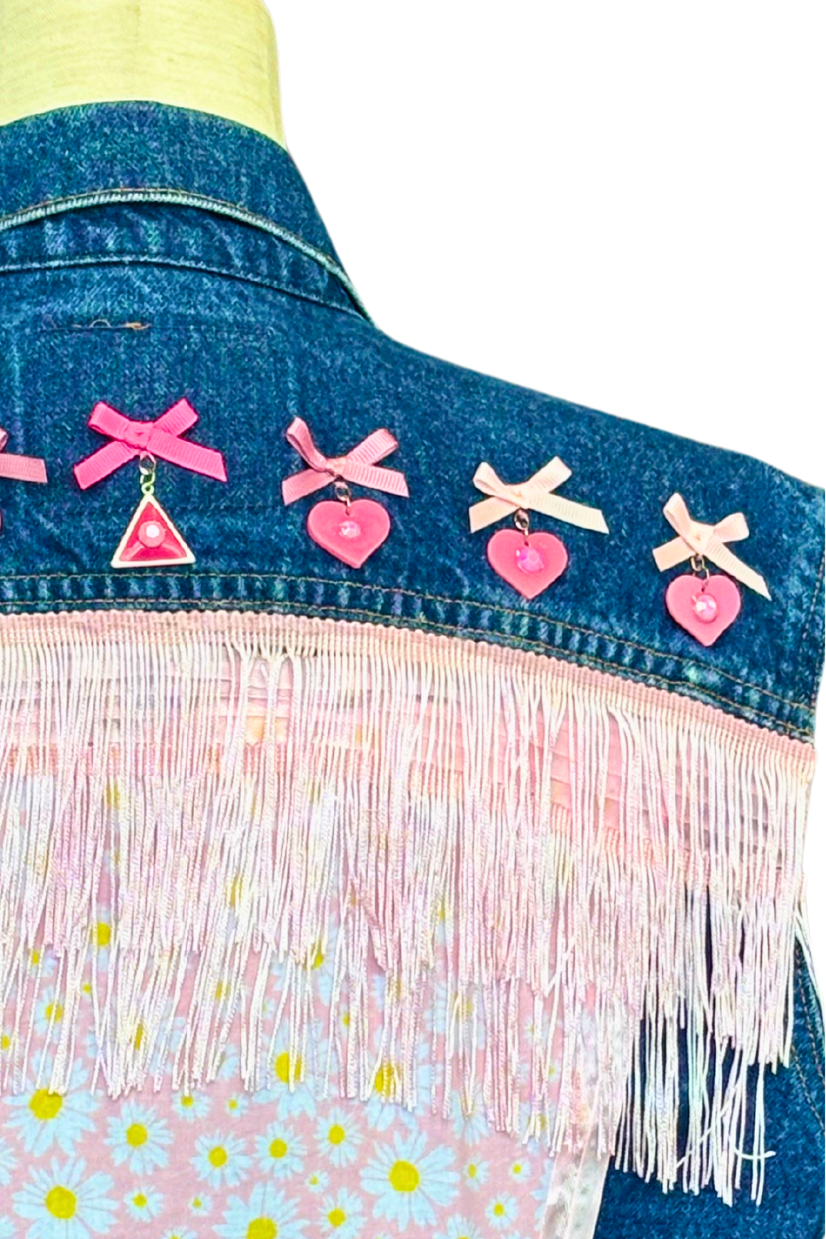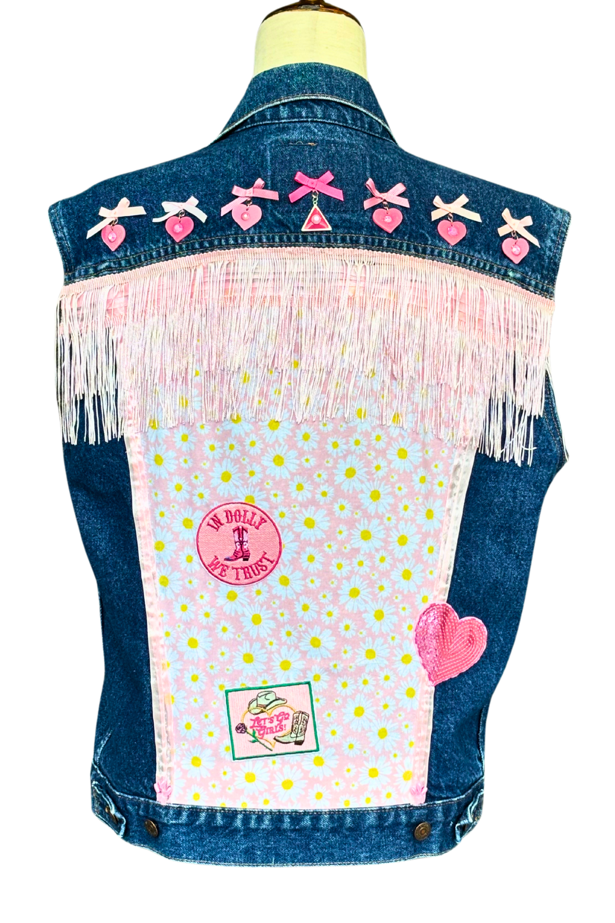 - Features: Hand-beaded pink striping along the pockets and seams, appliquéd pink hearts across the hem, and satin bows on the pockets and back yoke. The back panel is overlaid with pink daisy-print fabric, pink fringe across the shoulders, and standout patches—“In Dolly We Trust” and a western-themed heart/cowboy graphic.