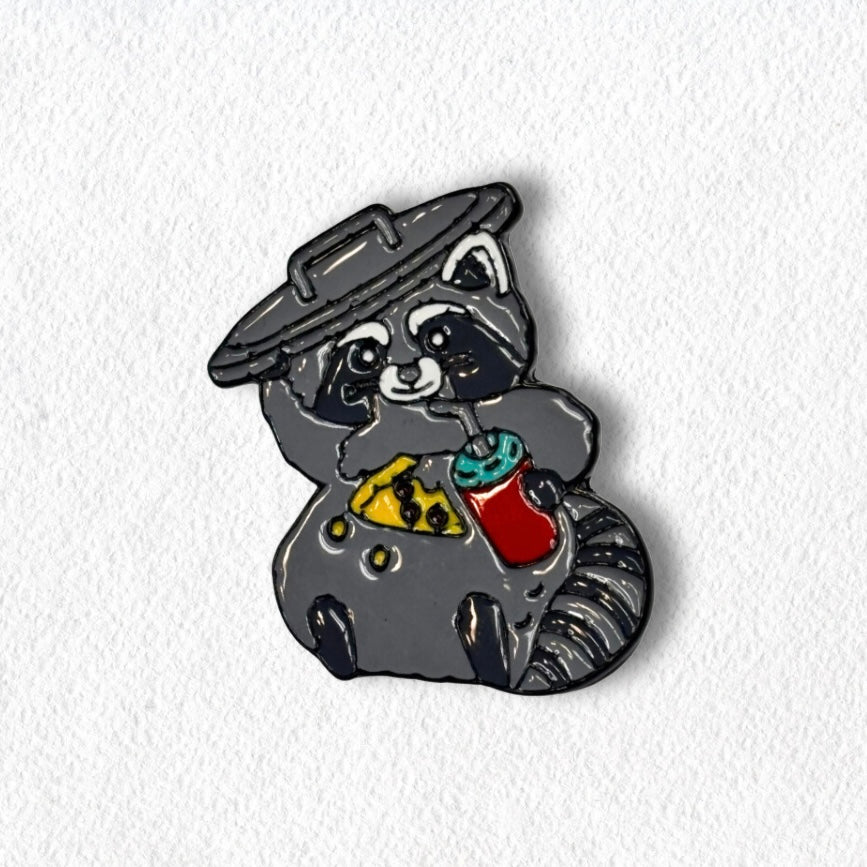 Celebrate the chaos and charm of everyone’s favorite nocturnal bandit—the raccoon! The “Trash Panda Snack Attack” pin features a mischievous raccoon enjoying a slice of pizza and a soda straight out of the trash.