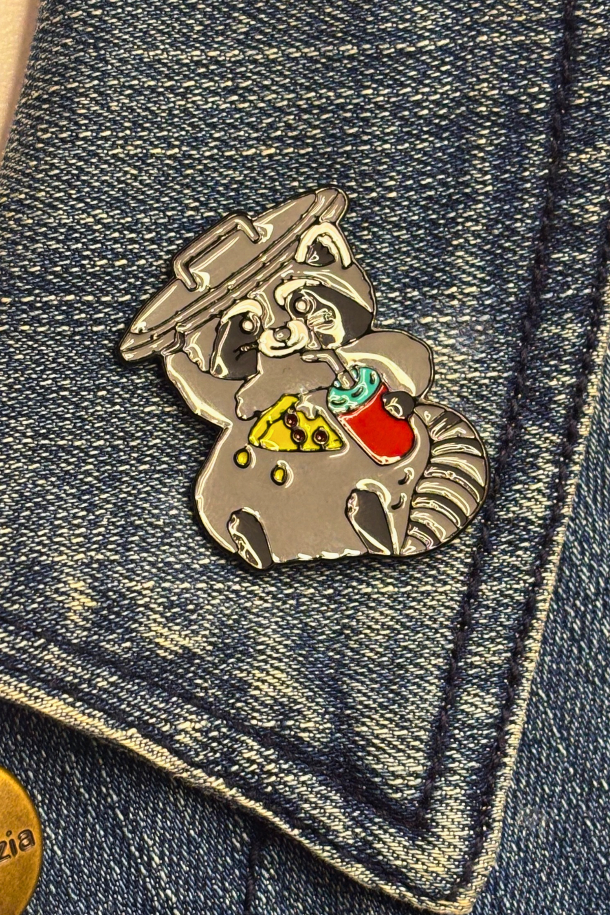 Add some humor to your collection and wear it proudly on your jacket, hat, or bag. Perfect for raccoon enthusiasts and snack lovers alike!