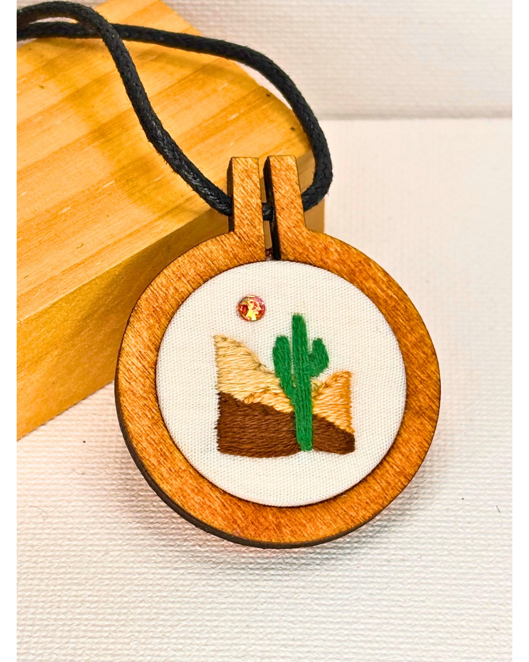 A tiny desert scene bathed in the warm glow of sunset. This hand-stitched mini hoop features a vibrant green cactus standing tall against layered desert mountains in rich earthy tones. A sparkling golden sun, accented with a tiny gemstone, completes the dreamy southwestern landscape. Flip it over, and the back shimmers with golden resin, capturing the glow of a desert sunset.