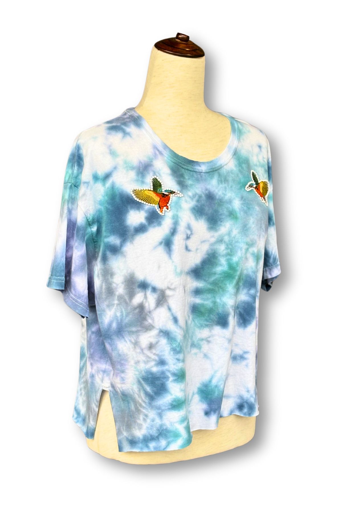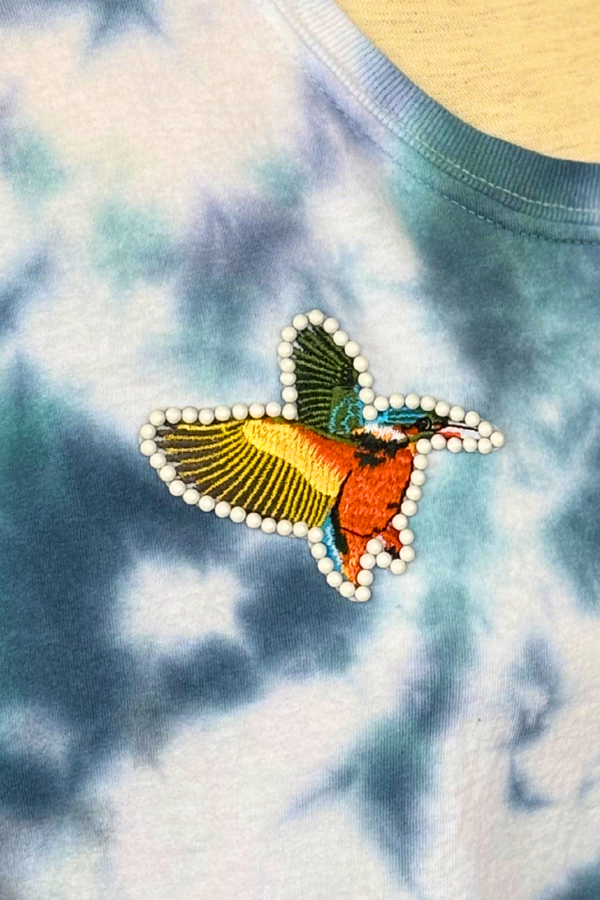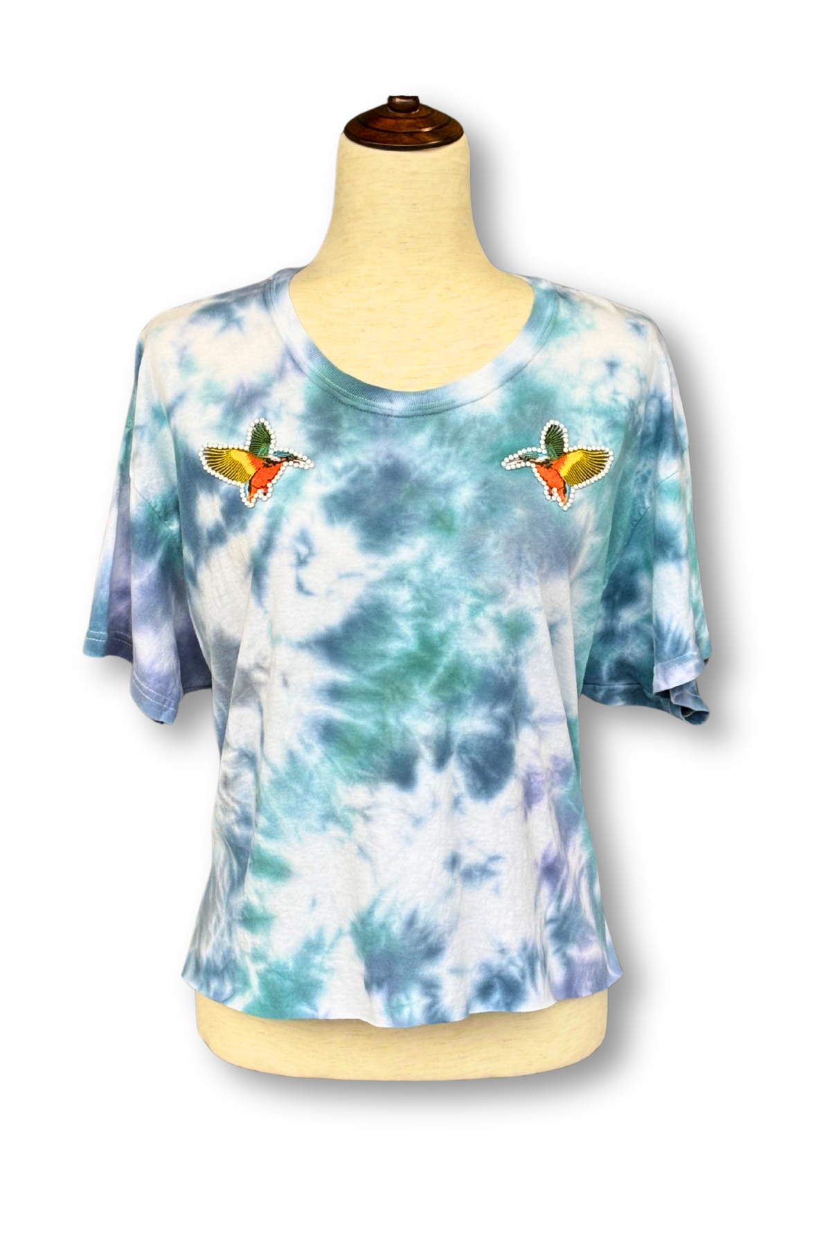 Light as air and full of movement, this dreamy crop tee captures the magic of hummingbirds in flight. Soft tie-dyed shades of blue and green swirl together like a cloudy sky, while two embroidered hummingbirds, accented with delicate white stones, add a touch of whimsy and elegance. Whether you’re floating through your day or making bold moves, this piece is the perfect blend of softness and statement.