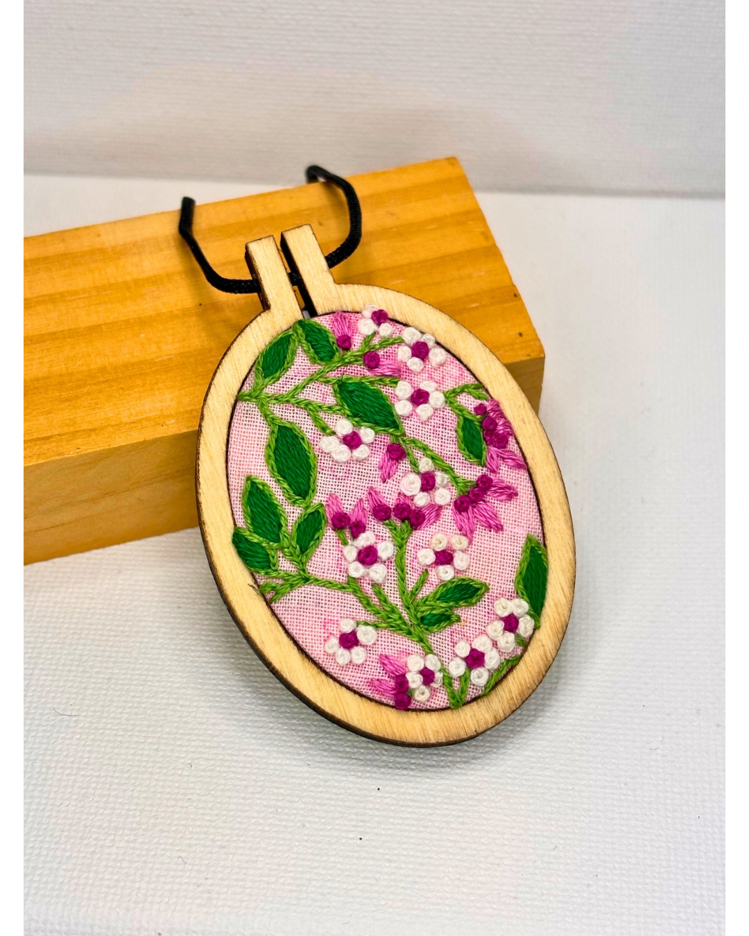 Hand-embroidered pink and white floral design on a pink fabric background.